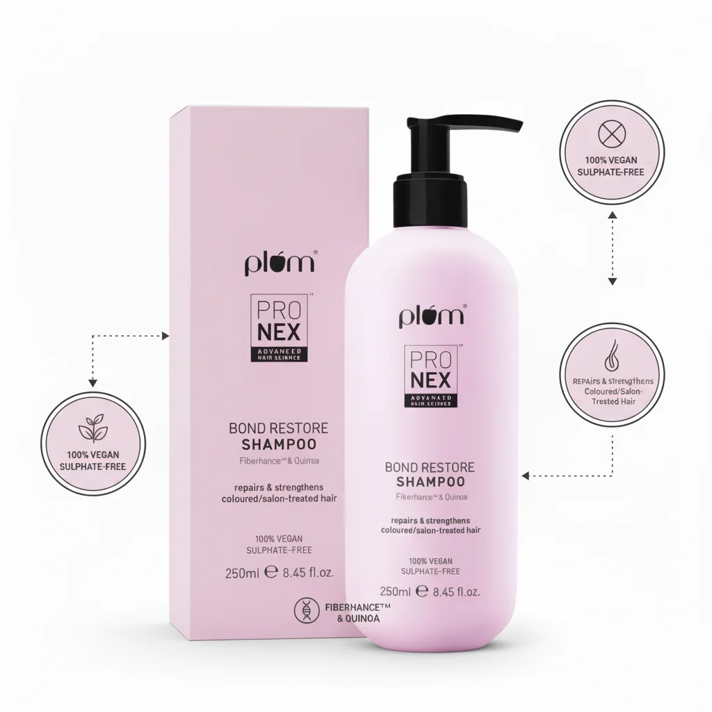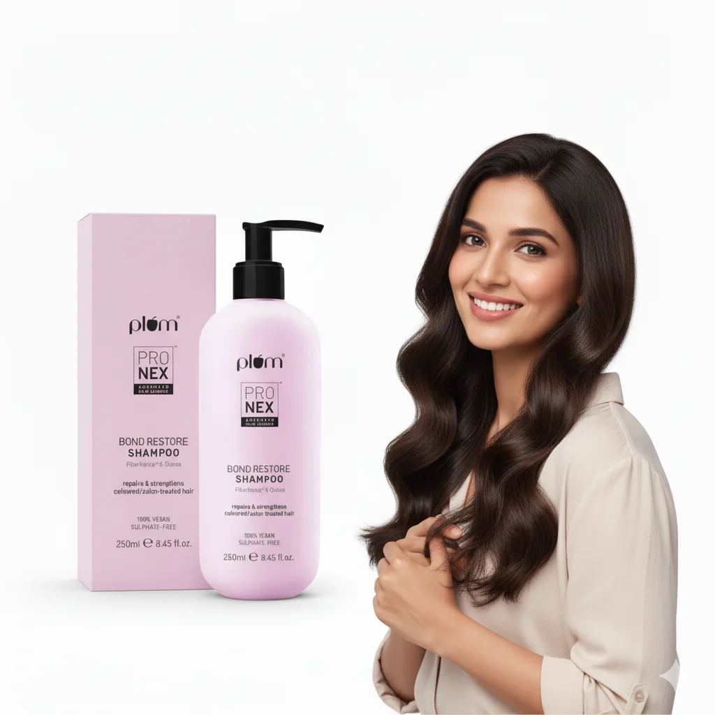 This is a Plum brand shampoo from their “ProNex” line, specifically formulated as a “Bond Restore Shampoo.” It is designed to “repair & strengthen” and is indicated for “cellwelled colored/color treated hair.” The shampoo is “100% VEGAN” and “SULPHATE-FREE,” appealing to users looking for gentle and ethical hair care options. The bottle features a pump dispenser and contains 250ml (8.45 fl. oz) of product. The packaging, both the bottle and the box, is a soft pink color with a minimalist design, emphasizing the “ProNex” technology. A smiling woman with visibly healthy, wavy dark hair is featured alongside the product, suggesting its beneficial effects.