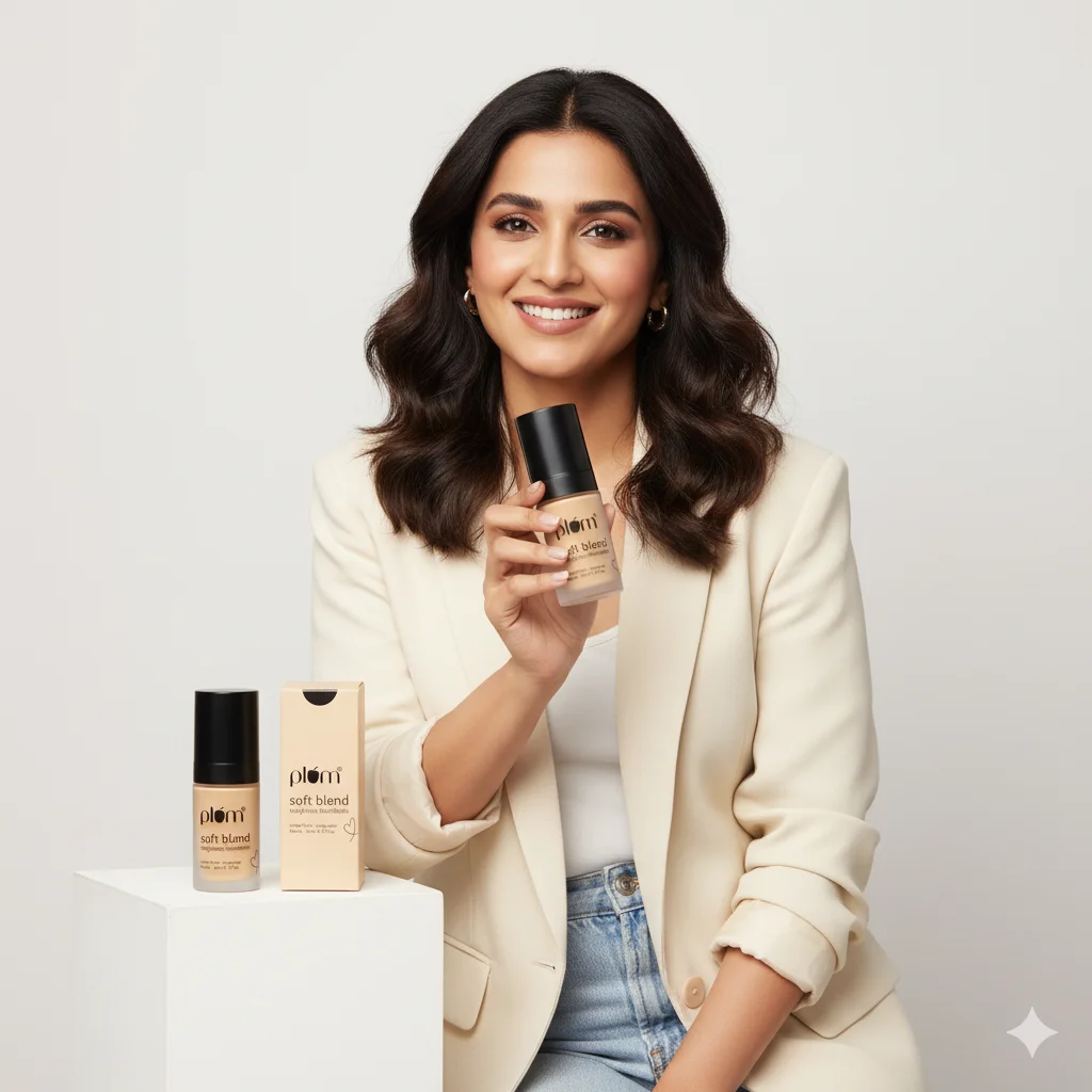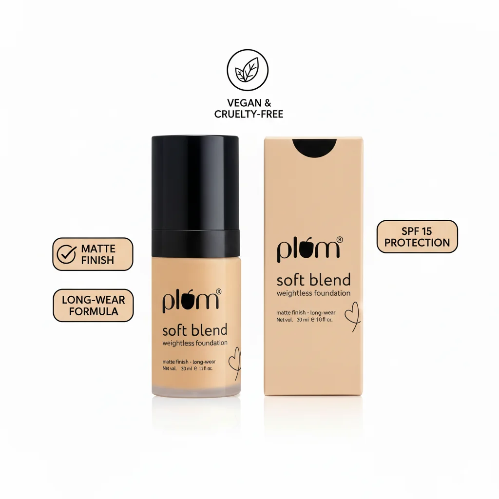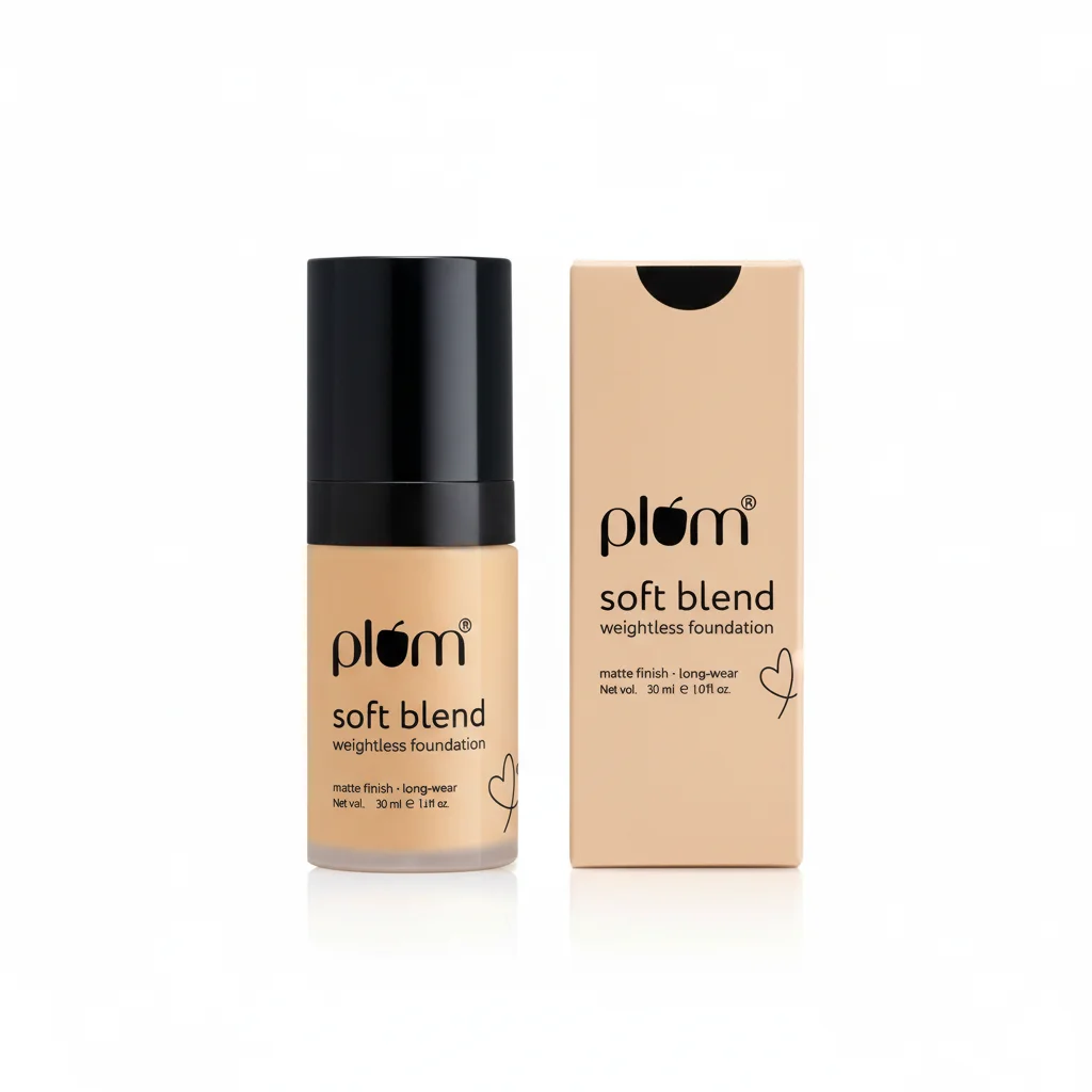 This is a liquid foundation from the brand Plum, designed for makeup application. It is marketed as a “Soft Blend Weightless Foundation,” indicating it’s formulated to feel light on the skin while providing a smooth, blendable finish. The label specifies it offers a “matte finish” and is “long-wear,” suggesting it helps control shine and stays on for extended periods. The product comes in a sleek bottle with a pump dispenser, containing 30 ml (or 1 fl. oz) of foundation. The packaging also features a small heart graphic, possibly hinting at a skin-loving or gentle formula.