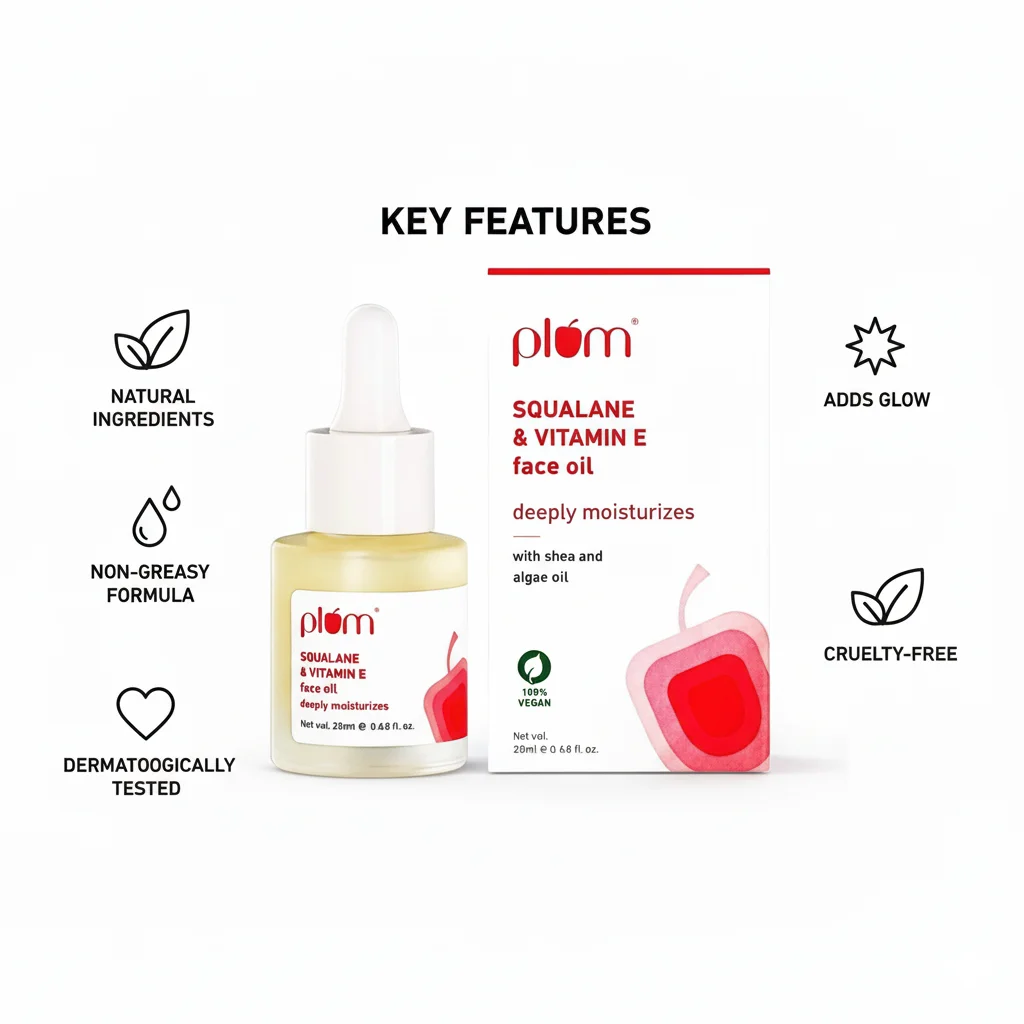 Nourish and deeply moisturize your skin with the Plum Squalane & Vitamin E Face Oil. This powerful face oil is expertly formulated to deliver intense hydration and essential nutrients, leaving your skin feeling supple, soft, and radiant. Infused with squalane, known for its exceptional moisturizing properties, and antioxidant-rich Vitamin E, this oil works to protect and rejuvenate your complexion. The gentle formula also includes the benefits of shea and algae oil, enhancing its nourishing capabilities. Presented in a clean, minimalist white and pink packaging with a convenient dropper bottle, this face oil ensures precise application and a luxurious skincare experience. It’s a 100% vegan product, aligning with ethical and conscious beauty practices.