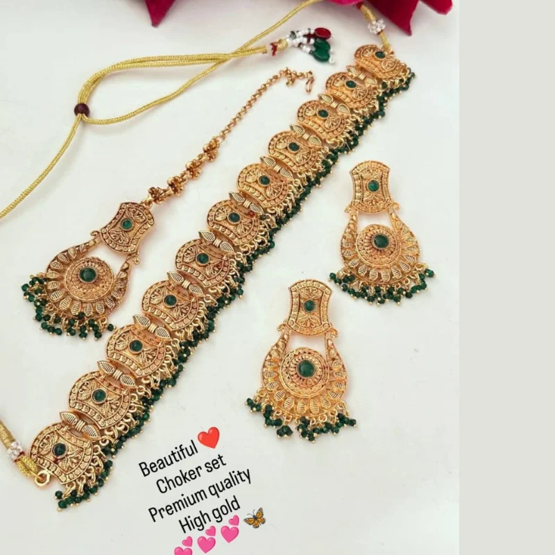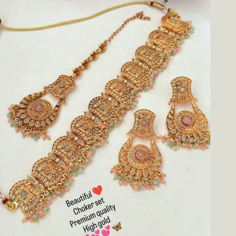 Premium Antique “High Gold” Plated Choker Necklace Set with Beads & Maang Tikka