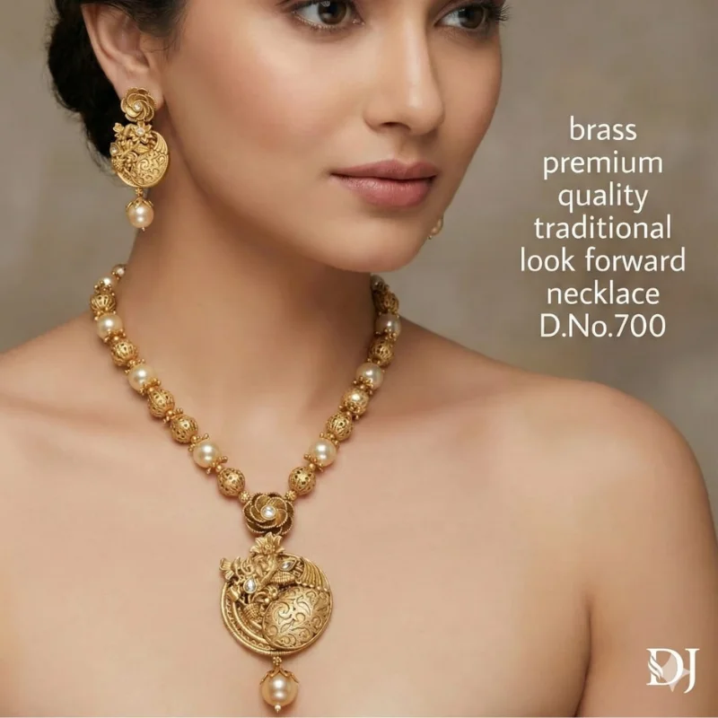 Channel timeless heritage and regal charm with this magnificent “Look Forward” traditional necklace set from the prestigious DJ Collection. Exquisitely crafted from premium-quality brass with a rich antique gold-toned finish, this set (Design No. 700) showcases the finest Indian jewelry artistry. The centerpiece is a grand circular pendant featuring an intricate peacock and floral motif, rendered in a sophisticated matte-gold texture that highlights every hand-carved detail. A single, lustrous pearl dangles gracefully from the base of the pendant, adding a touch of classic elegance.