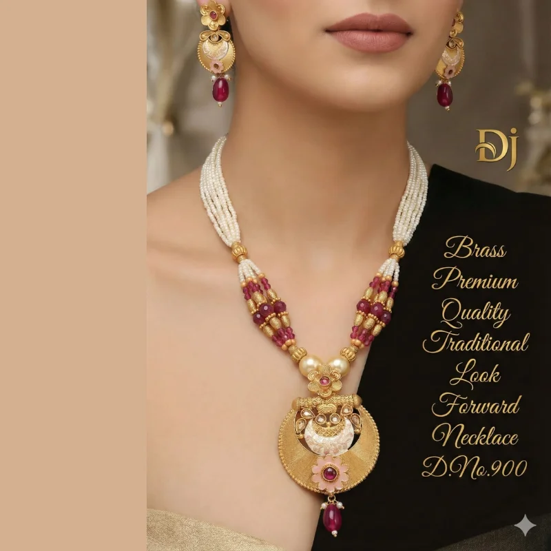 Discover the epitome of timeless grace with this exquisite “Look Forward” traditional necklace set from the prestigious DJ Collection. Meticulously crafted from premium quality brass with a rich gold-toned finish, this set (Design No. 900) is a true testament to royal Indian aesthetics. The necklace features five elegant strands of lustrous white seed pearls, accented by clusters of faceted ruby-pink beads and ornate golden spacers that add a regal pop of color.