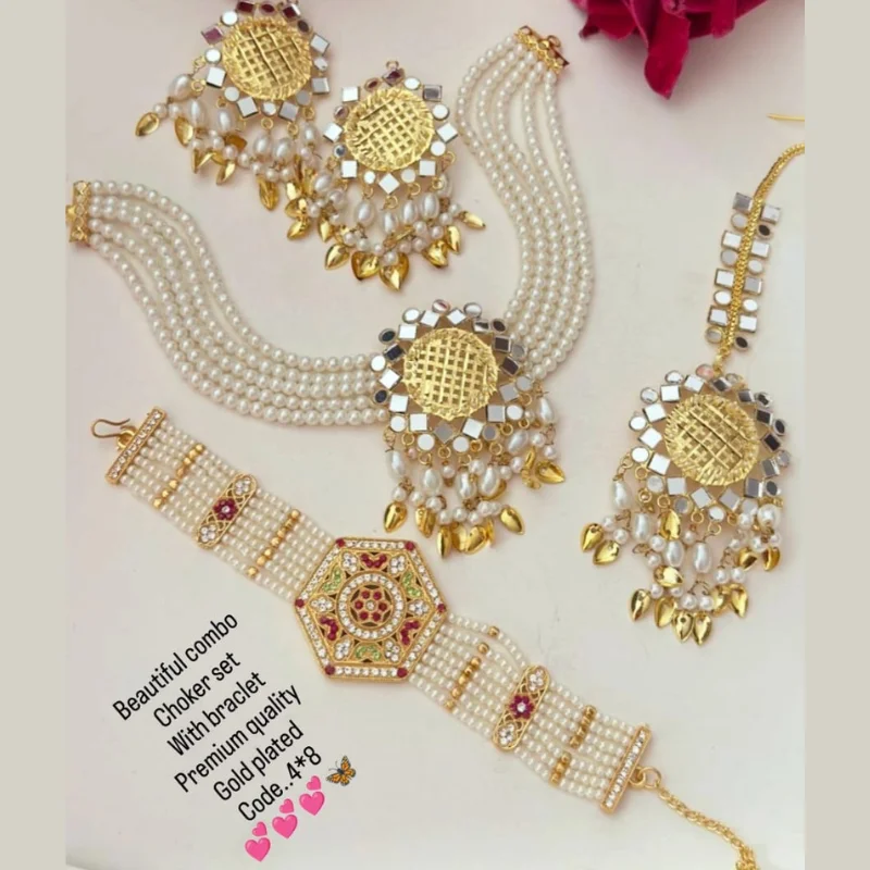 Premium Gold-Plated Mirror-Work Multi-Strand Pearl Choker Jewelry Set