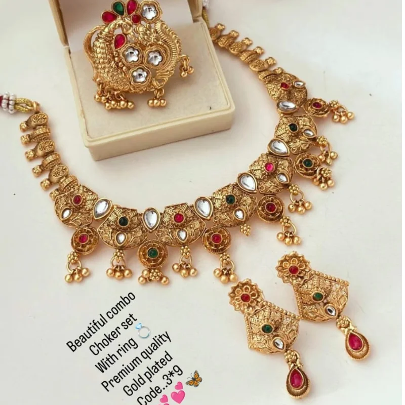 Elevate your ethnic wardrobe with this exquisitely crafted jewelry combo, designed for the modern woman who cherishes traditional artistry. This “Beautiful Combo” features a stunning choker necklace, a pair of matching drop earrings, and a bold, oversized statement ring, all finished in high-quality gold plating.