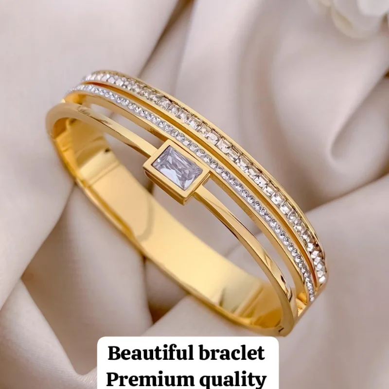 Crafted with a luxurious gold-tone finish, this bangle combines modern minimalism with high-fashion sparkle. The mixed-cut stones catch the light beautifully, making it an ideal statement piece for evening wear or a chic addition to a professional wardrobe. Its sturdy hinged design ensures a secure fit while providing the ease of effortless one-handed wear.