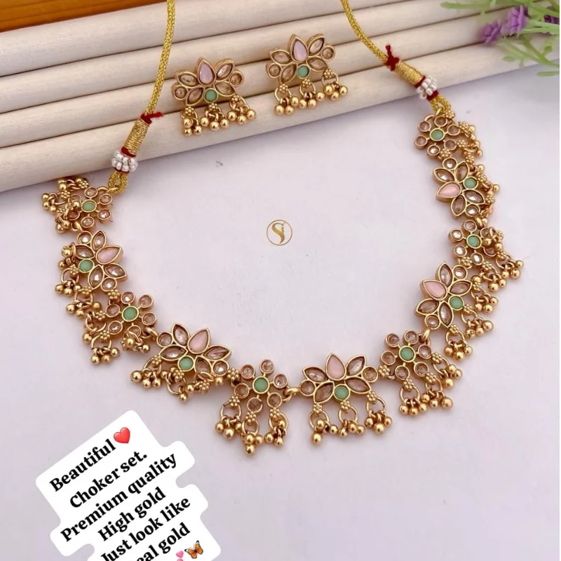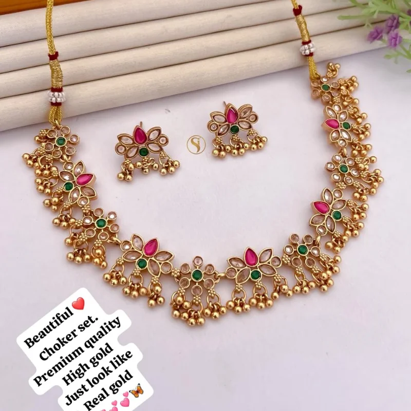 Premium High-Gold Floral Choker Set with Stones and Bead Dangles