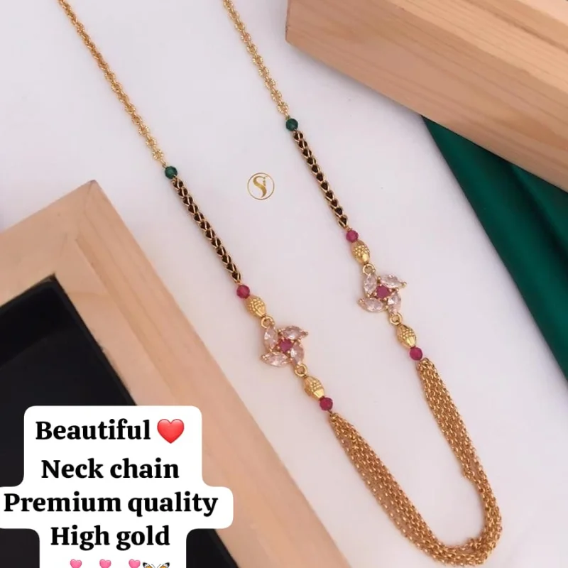 Step out in style with this exquisite Premium Quality Neck Chain, a stunning fusion of traditional Mangalsutra significance and contemporary floral fashion. Crafted with a lustrous “High Gold” finish, this piece radiates the warmth and shine of real gold jewelry.