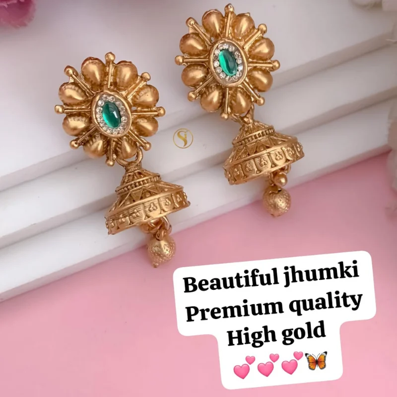 Discover the charm of traditional artistry with these Premium Quality High-Gold Jhumki Earrings. Designed for the modern woman who cherishes ethnic heritage, these earrings feature a luxurious matte gold finish that mimics the elegance of antique temple jewelry.