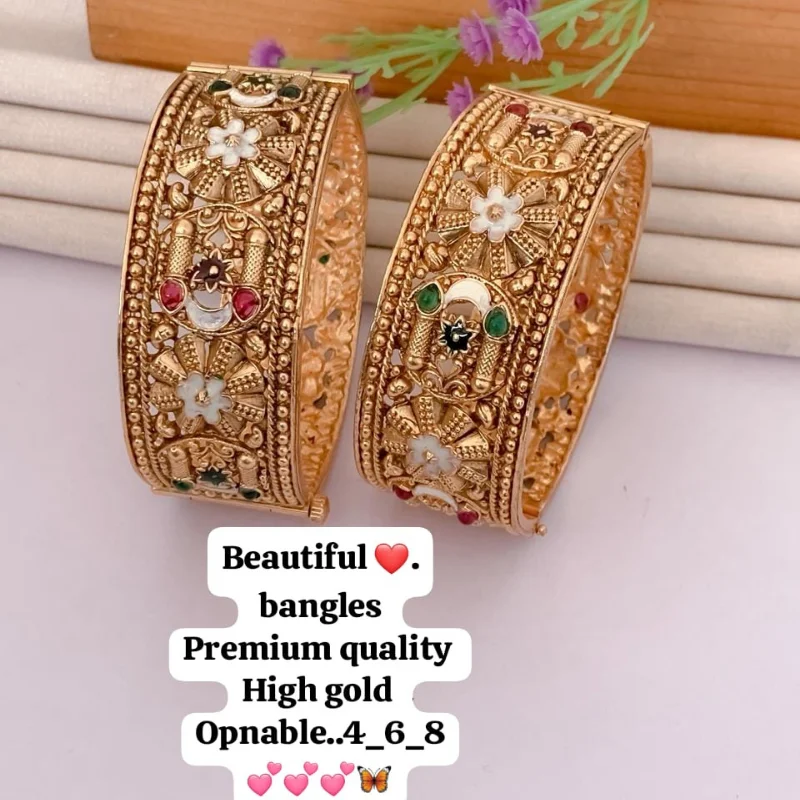 The detailed craftsmanship continues with the inclusion of ruby-red and emerald-green stone accents, along with crescent moon-shaped enamel detailing, adding a splash of festive color. The edges are finished with a classic beaded border (rava work), giving the pieces a textured, royal feel. Designed for modern convenience without compromising on style, these bangles feature a sturdy openable mechanism, making them easy to slide on and off. They are the perfect statement accessory for weddings, festive celebrations, and traditional Indian attire.
