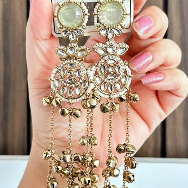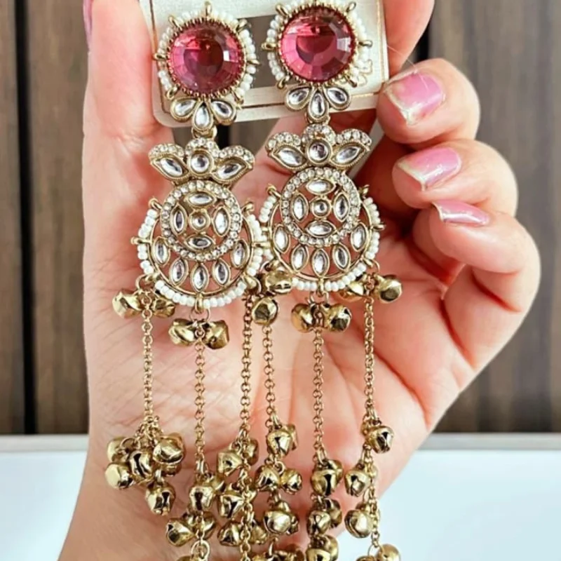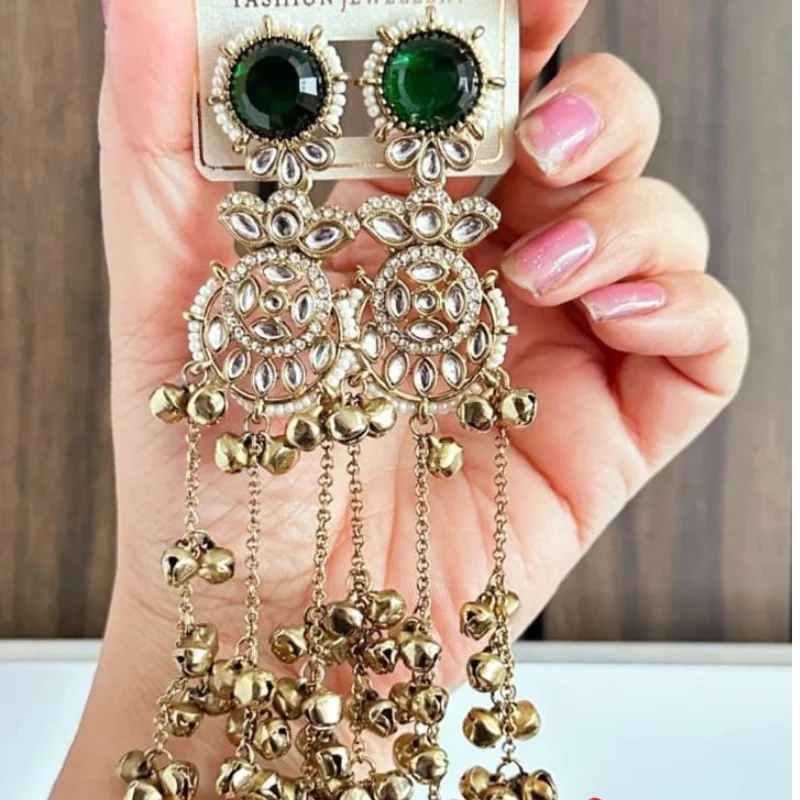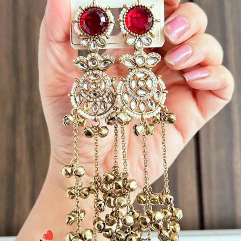 Premium Mehendi Polish Ruby Stone & Kundan Long Tassel Earrings with Golden Ghungroo Chains
