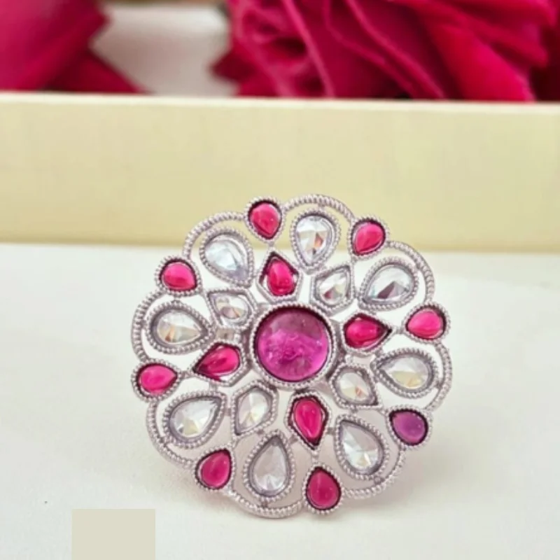 Premium Rhodium-Plated Floral Statement Ring – Adjustable Silver-Toned Cocktail Ring with Crystal Accents