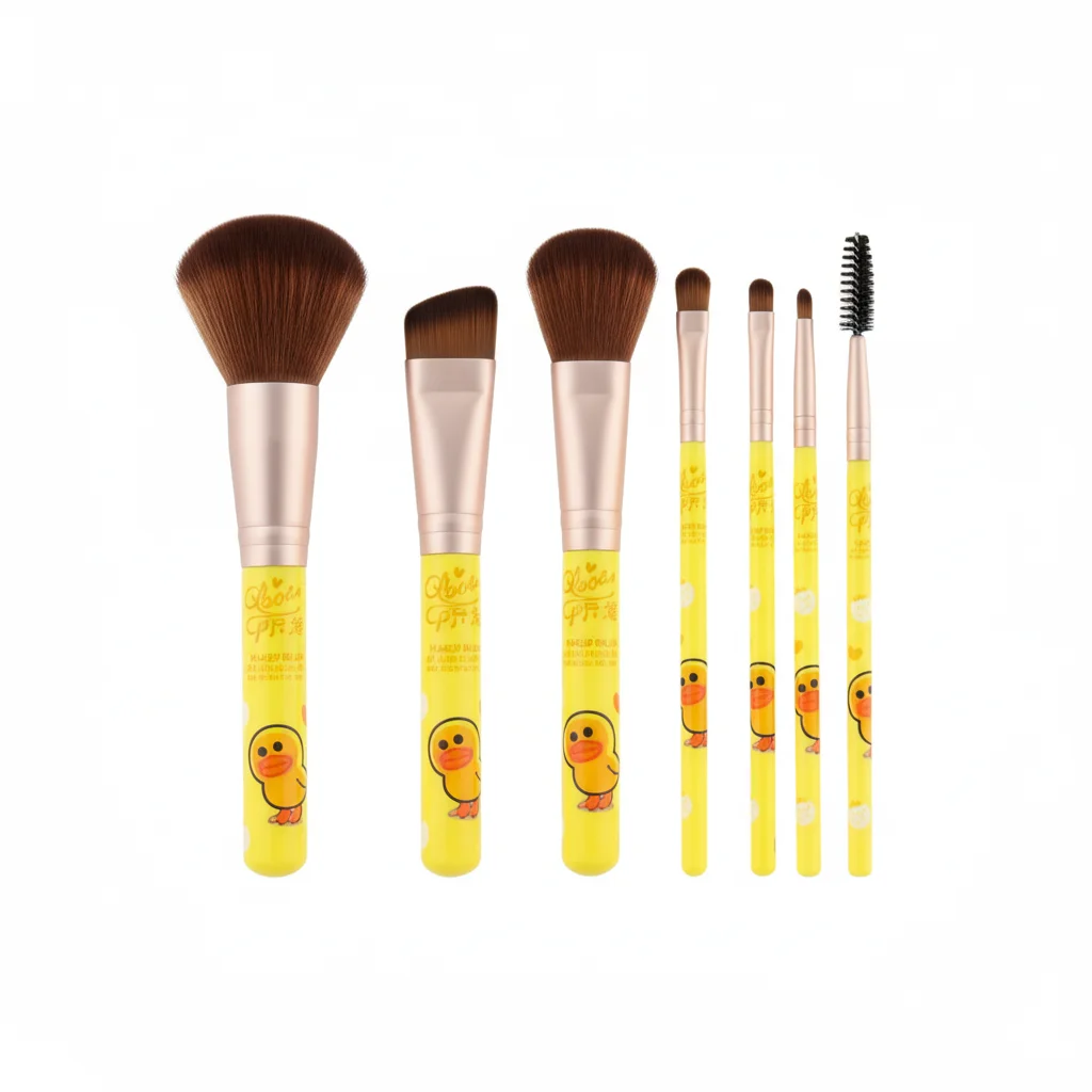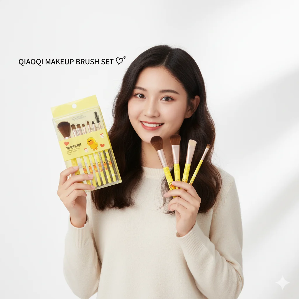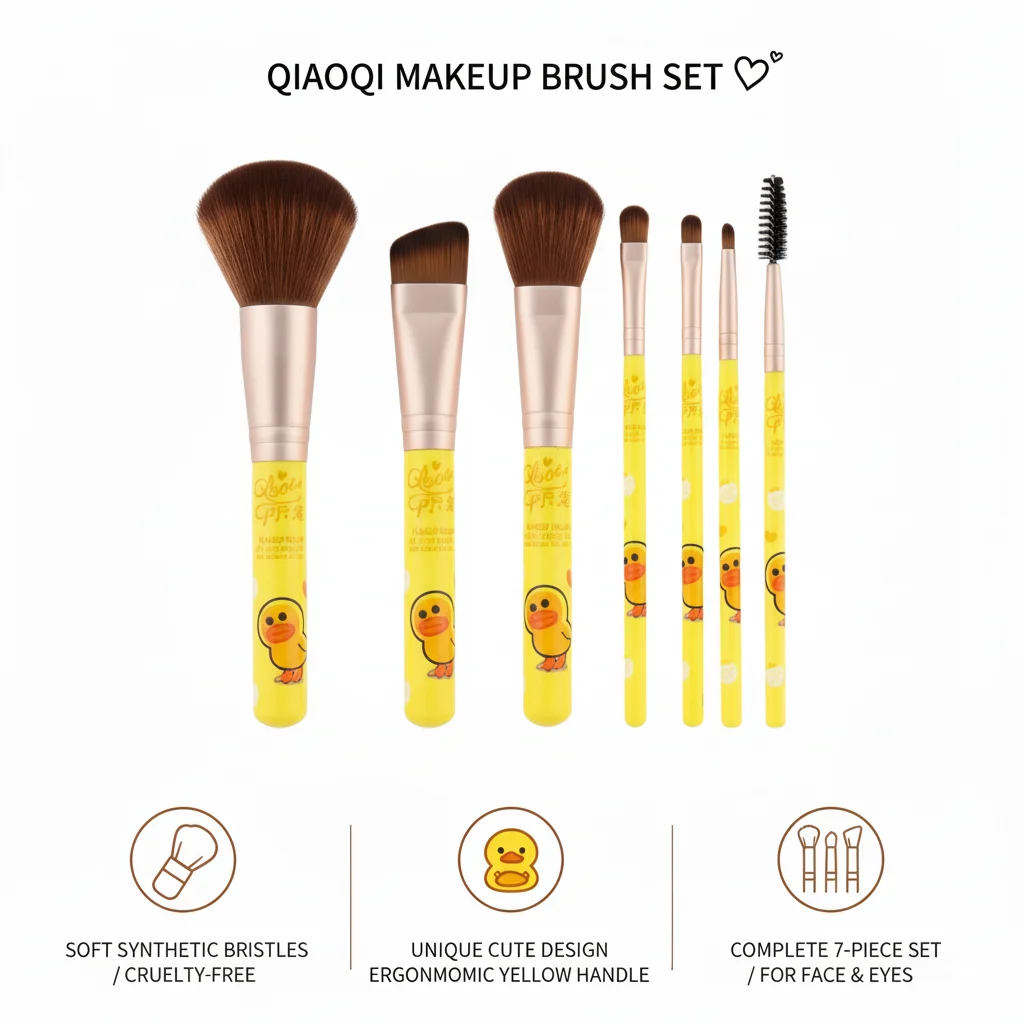 The QIAOQI Makeup Brush Set is a charming and comprehensive collection of beauty tools designed for various makeup applications. The set is presented in cheerful, yellow-themed packaging featuring cute chick illustrations, suggesting a fun and youthful appeal. It includes a variety of brushes, ranging from larger face brushes to smaller, more precise eye brushes, as well as an eyebrow/lash comb. The handles of the brushes are also yellow with matching chick designs, making them visually appealing and easy to identify. This set appears to be an ideal starter kit or a delightful addition for those who appreciate cute aesthetics in their beauty regimen.