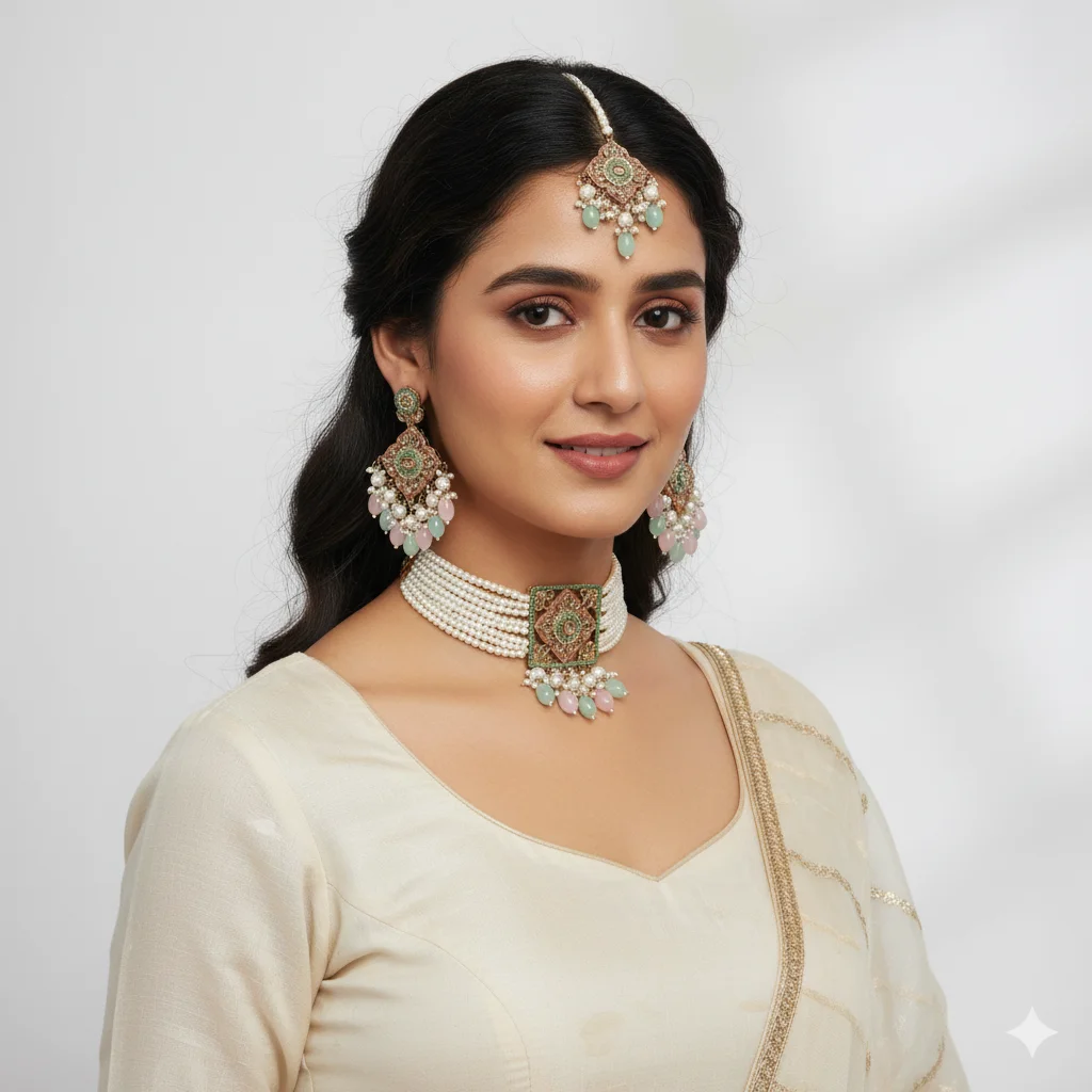 Elevate your ethnic ensemble with this breathtaking Pastel Pearl Choker Jewellery Set, a perfect blend of traditional grandeur and contemporary elegance. This handcrafted set is designed for the modern woman who appreciates the subtlety of pastel hues combined with the richness of Indian craftsmanship.