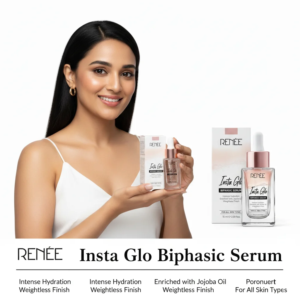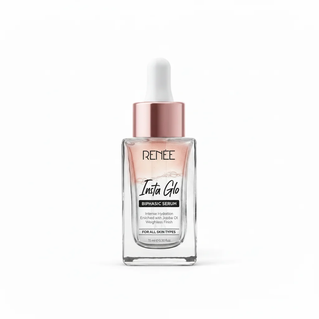 The RENÉE Insta Glo Biphasic Serum is an advanced skincare product designed to provide intense hydration and a weightless finish, aiming to give an instant glow to the skin. “Biphasic” indicates that the serum consists of two distinct liquid layers, often an oil and a water-based solution, which need to be shaken before use to combine their benefits. The packaging, with its clear glass dropper bottle and rose gold accents, suggests a premium and elegant product. The box highlights “Intense Hydration” and “Enriched with Jojoba Oil,” indicating nourishing ingredients. It is formulated for “ALL SKIN TYPES.”
