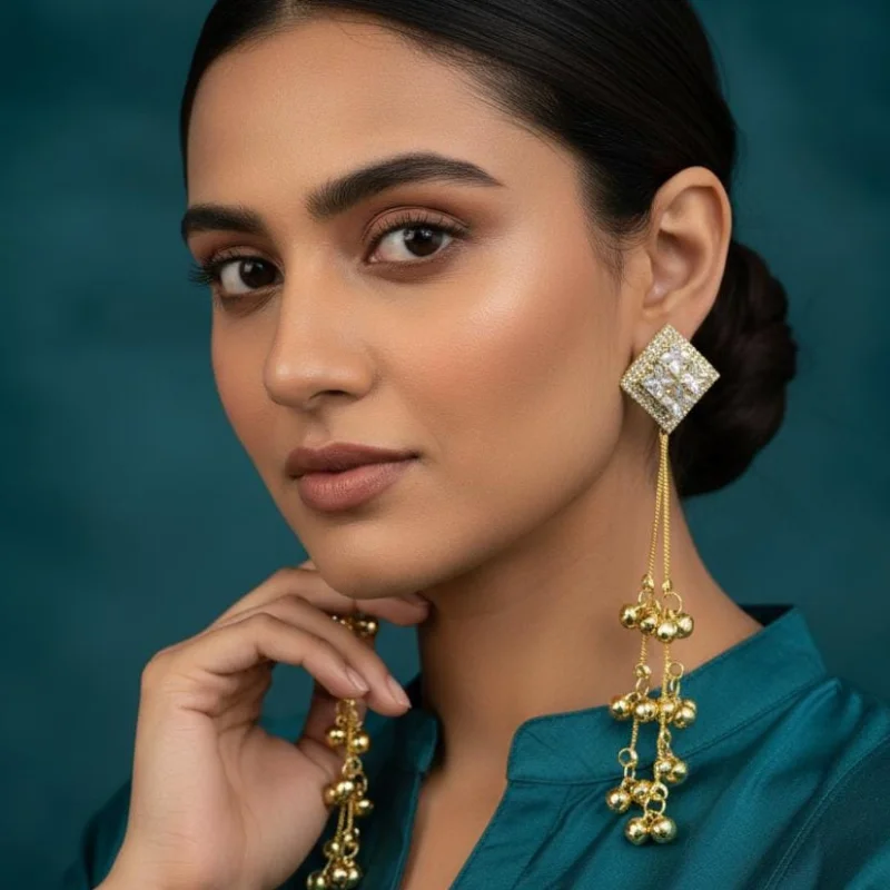 Suspended from each geometric stud is a waterfall of three delicate gold-toned chains in staggered lengths. Each strand is punctuated with clusters of polished gold beads, drawing inspiration from the rhythmic beauty of traditional Indian ghungroo bells. The contrast between the brilliant crystal-encrusted top and the fluid, metallic movement of the tassels makes these earrings a high-impact accessory for grand weddings, gala events, or contemporary festive celebrations.