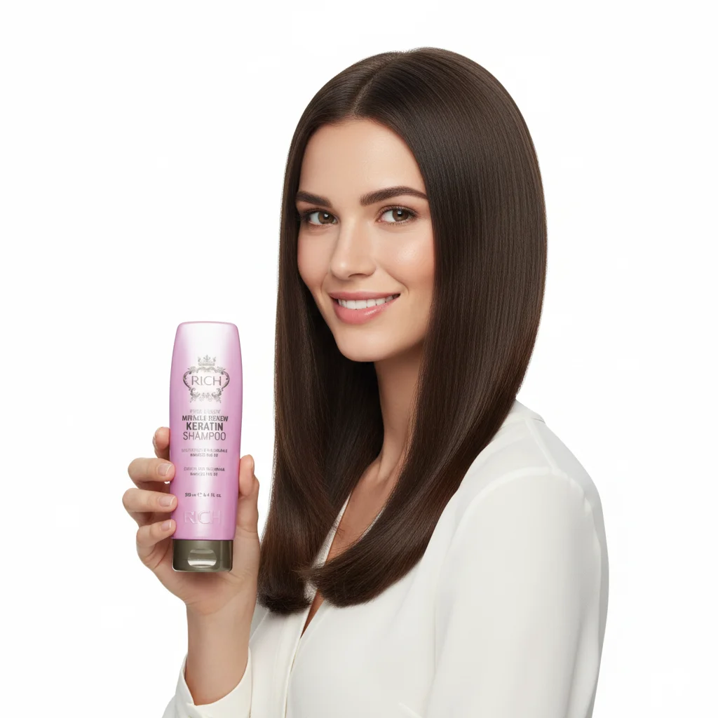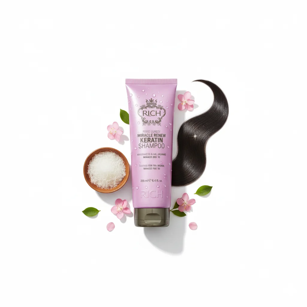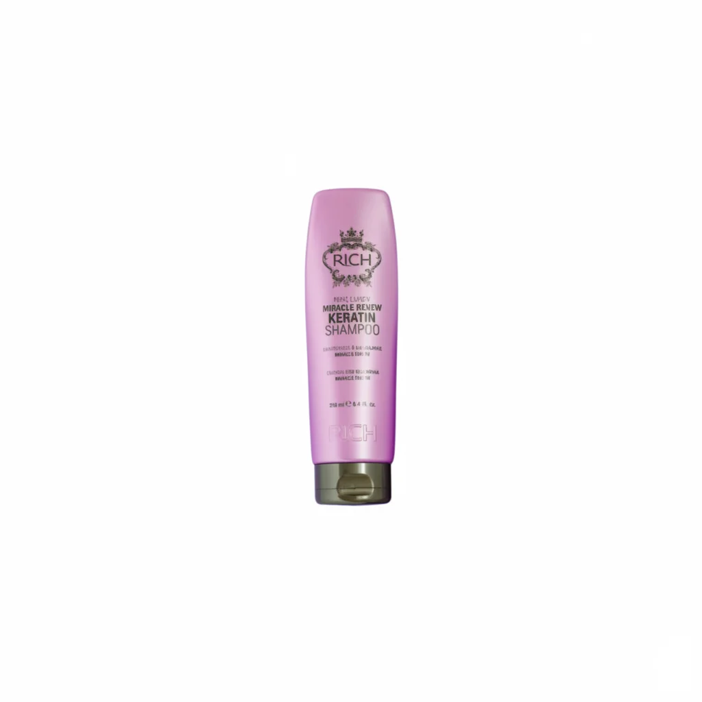 The RICH Pure Luxury Miracle Renew Keratin Shampoo is designed to revitalize and strengthen hair, leaving it smoother, shinier, and more manageable. Formulated with keratin, a vital protein for hair health, this shampoo works to repair damaged strands, reduce frizz, and protect against future breakage. It aims to restore the hair’s natural luster and softness, making it suitable for all hair types, especially those prone to damage, dryness, or frizz. The luxurious formula cleanses gently while infusing hair with nourishing ingredients for a healthier appearance.