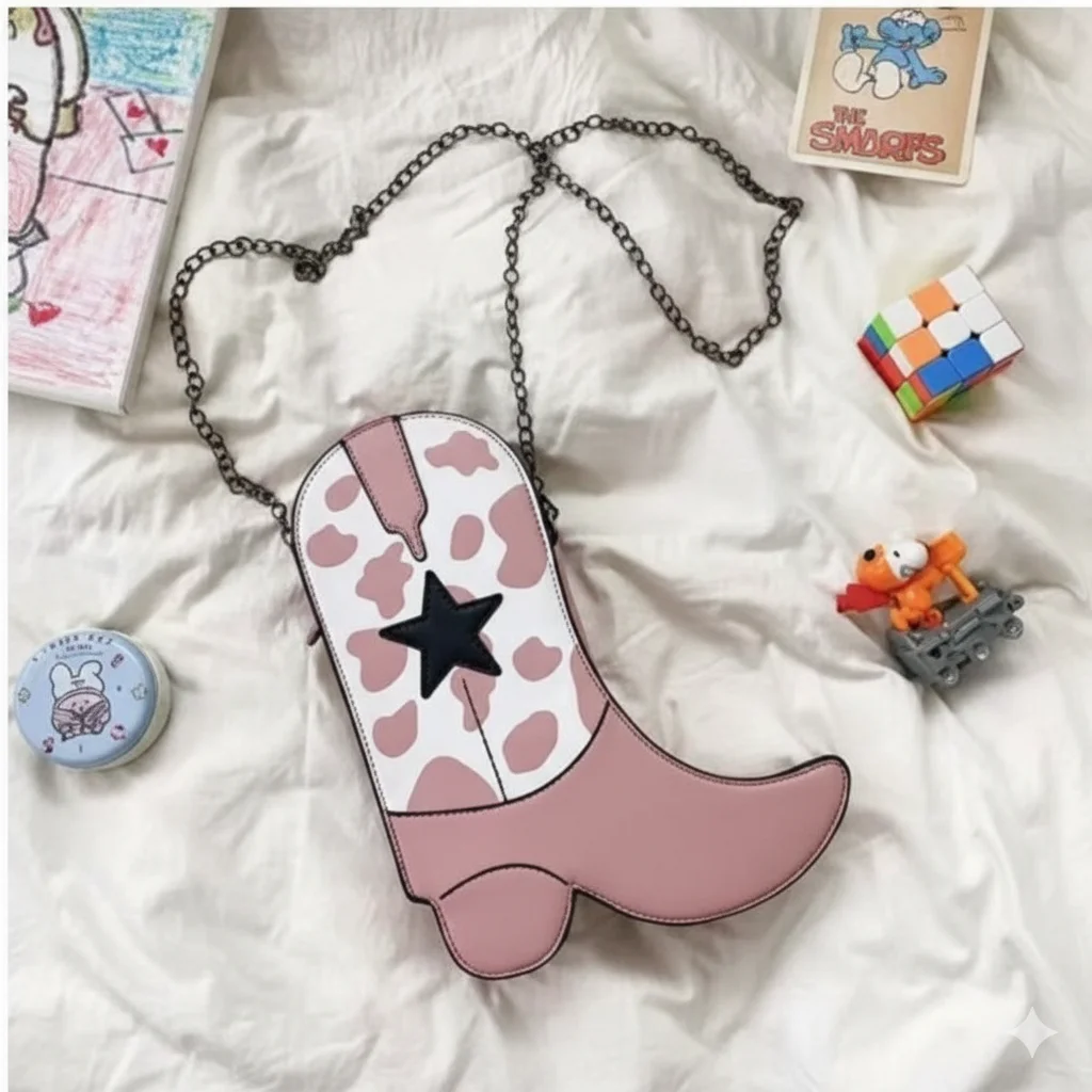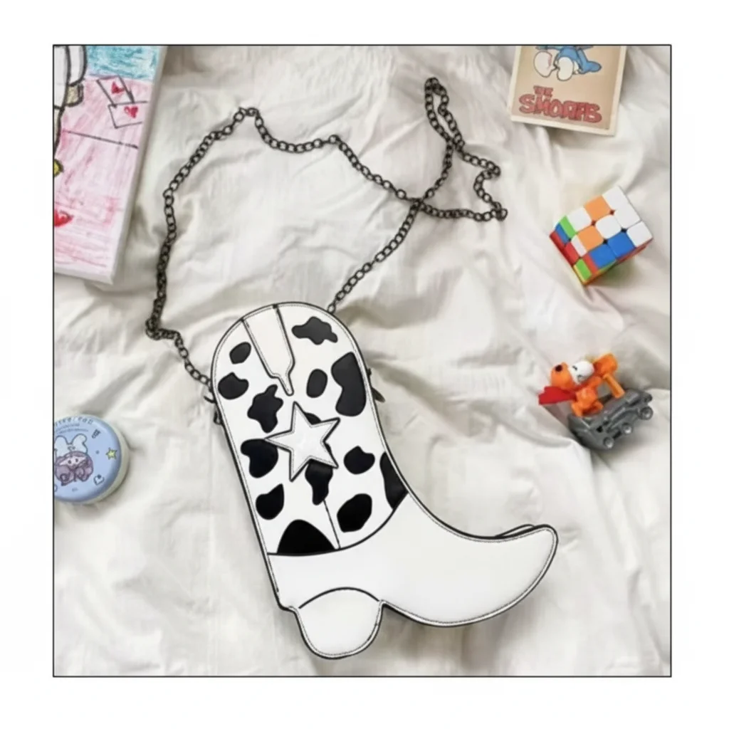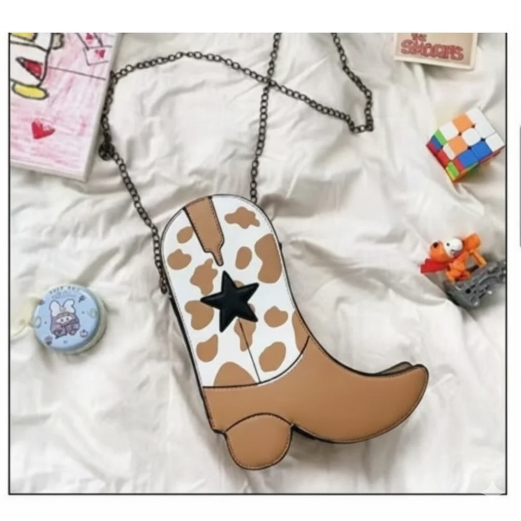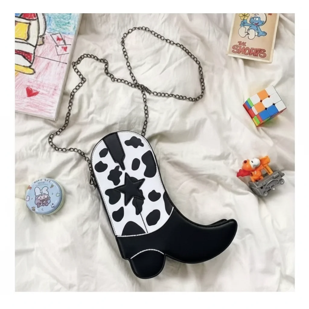Rodeo Sweetheart: Cowgirl Boot Shaped Crossbody Bag with Cow Print & Star