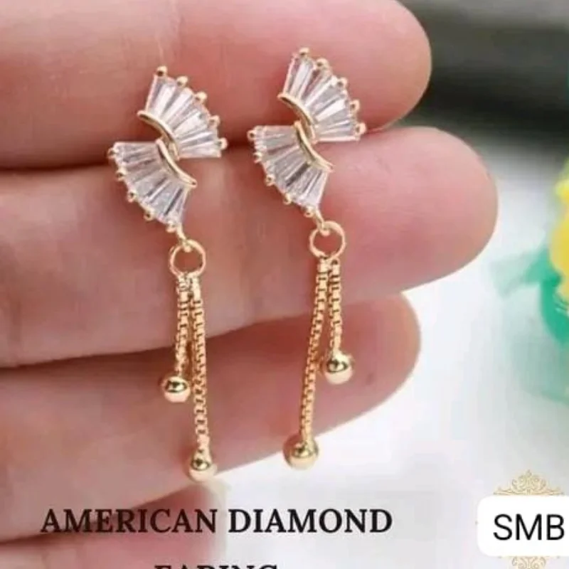 Step into elegance with these designer drop earrings from SMB, a perfect blend of modern sophistication and timeless sparkle. These exquisite earrings feature a unique “dual fan” or “wing” motif at the top, meticulously handset with premium baguette-cut American Diamonds (Cubic Zirconia) that capture light from every angle.