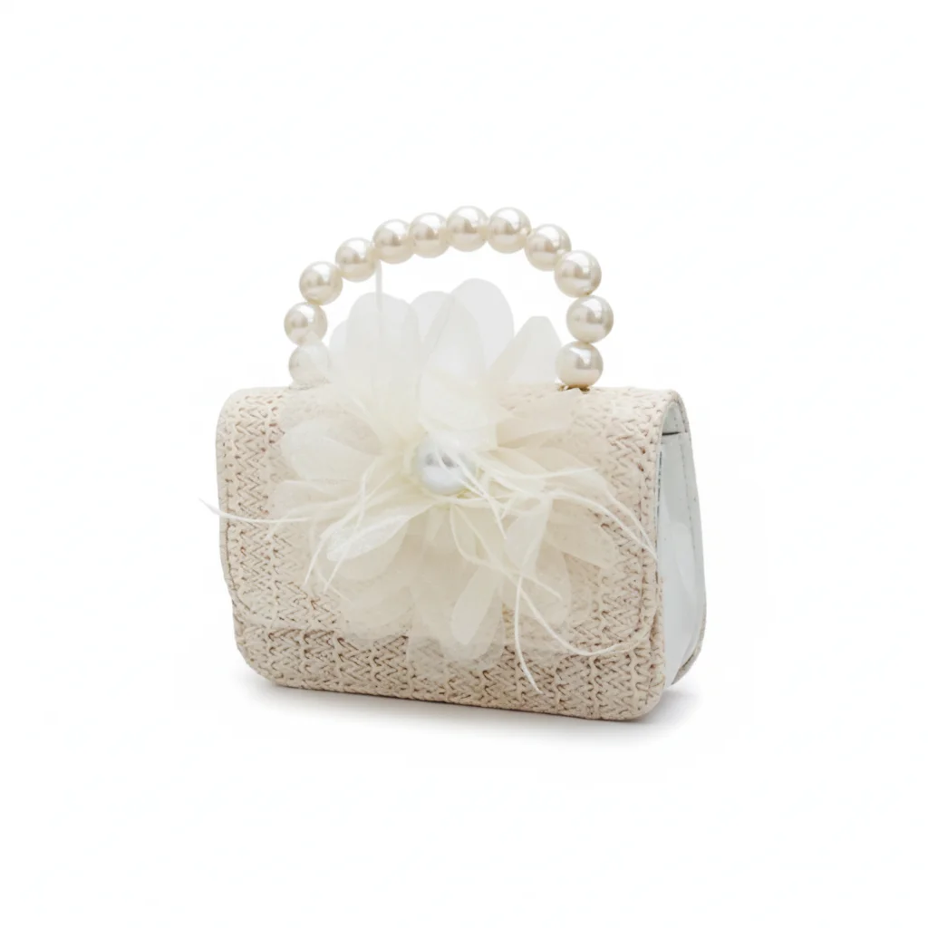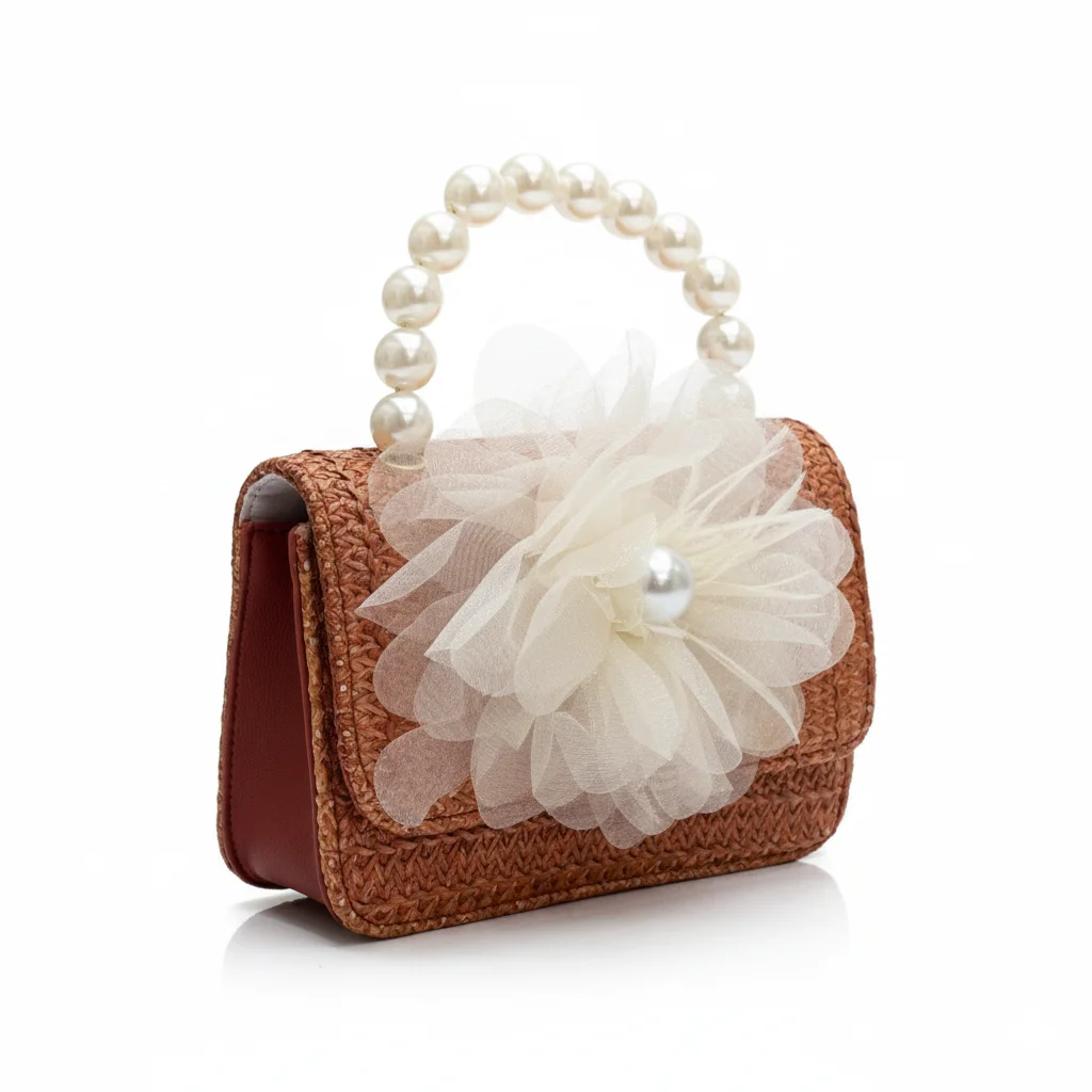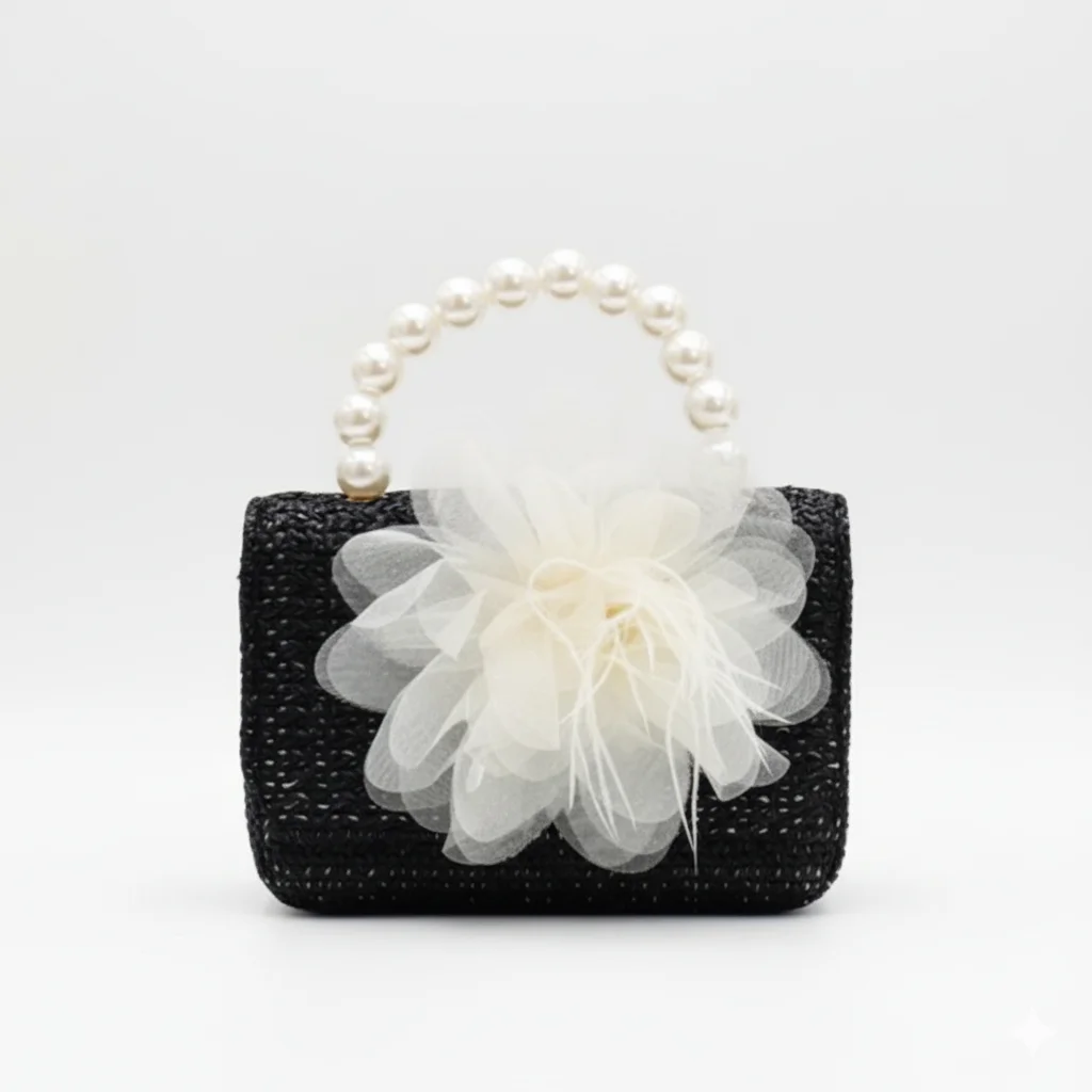 Rustic Chic Woven Mini Handbag with Pearl Top Handle & Statement Tulle Flower – Bohemian Summer Clutch