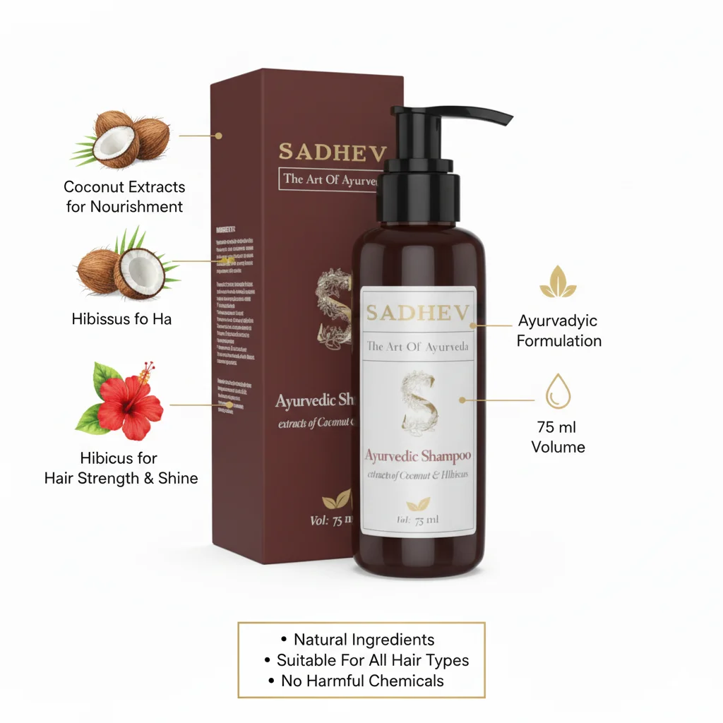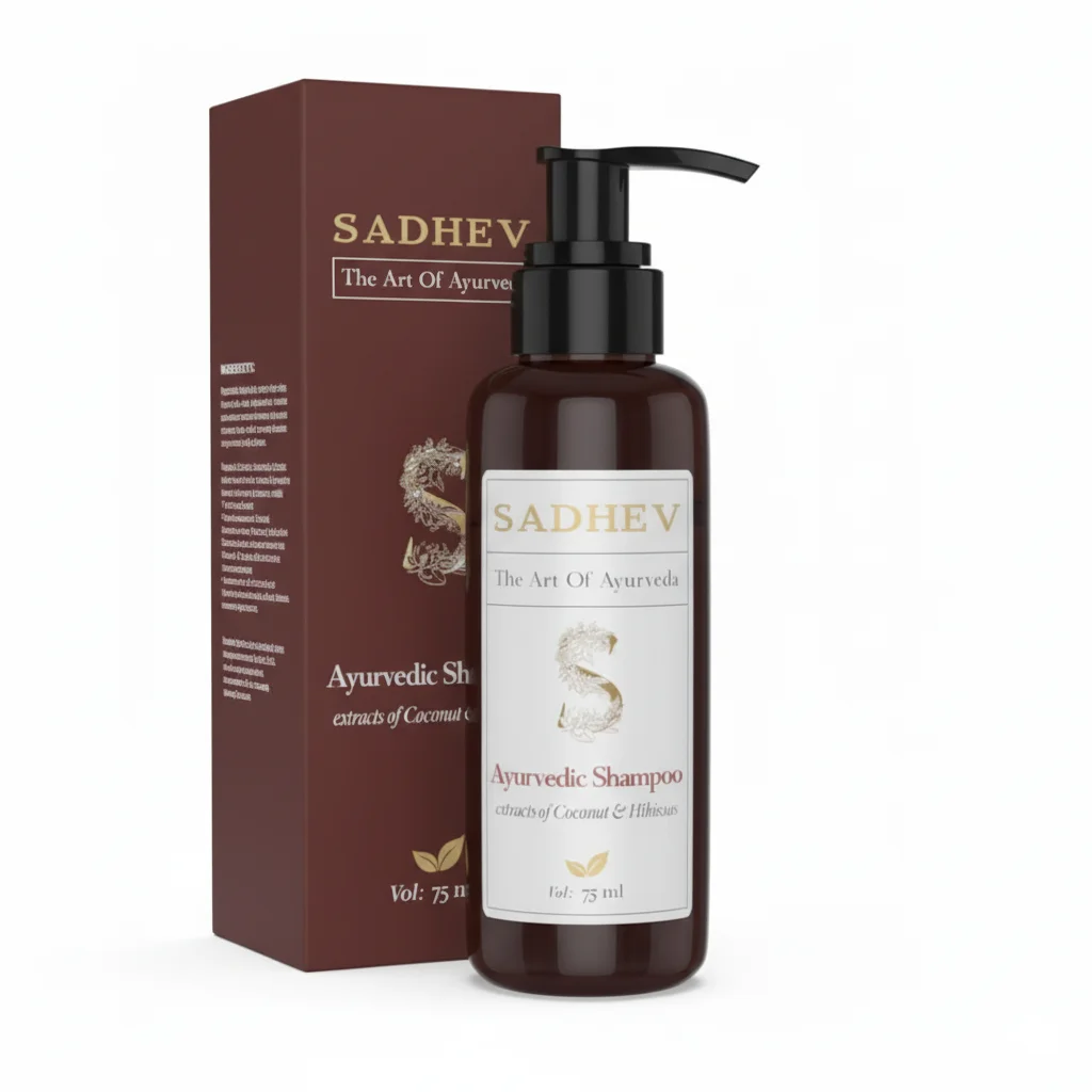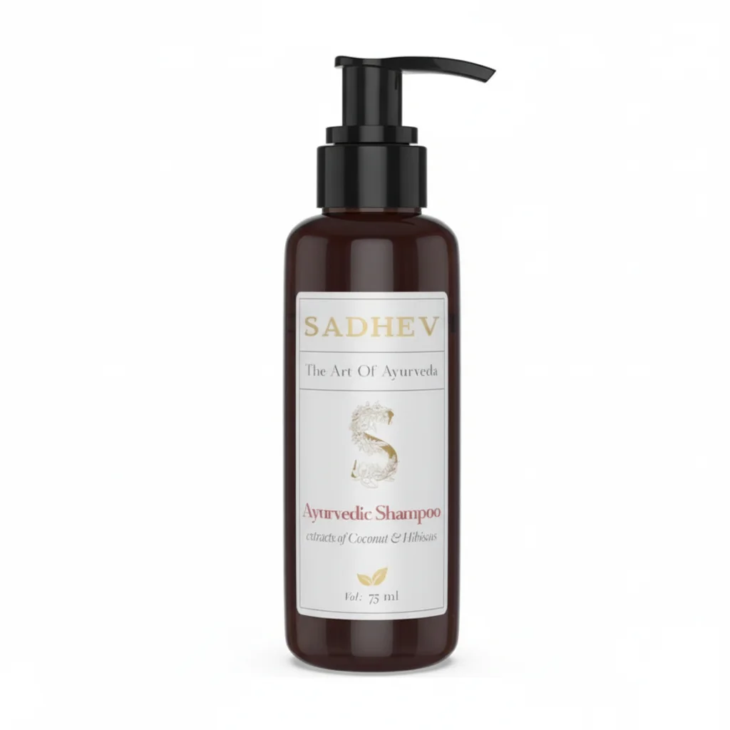 This product is an Ayurvedic shampoo from the brand SADHEV, which positions itself with the tagline “The Art Of Ayurveda.” It’s formulated with natural extracts of Coconut and Hibiscus, ingredients traditionally valued in Ayurvedic practices for their benefits to hair health. The shampoo comes in a dark brown bottle with a pump dispenser, suggesting ease of use and a focus on natural/earthy aesthetics. The volume is specified as 75 ml, indicating it might be a travel-sized or trial-sized product. The packaging, including the accompanying dark brown box, features the brand’s name prominently, along with a stylized “S” logo and leaf motifs, reinforcing its natural and Ayurvedic roots. The inclusion of Coconut and Hibiscus extracts points towards benefits like conditioning, strengthening, and promoting healthy hair growth, which are common associations with these ingredients in Ayurvedic hair care.