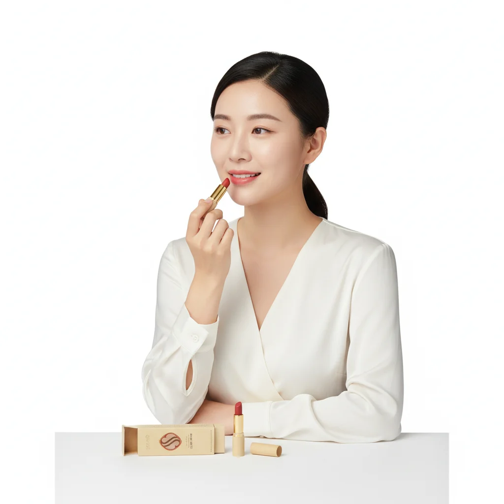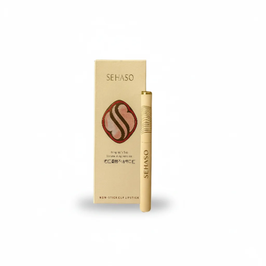 The SEHASO Non-Stick Cup Lipstick is presented in sophisticated beige and gold packaging, suggesting an elegant cosmetic product. The name itself highlights its primary feature: a “non-stick cup” formula. This indicates that the lipstick is designed to be long-wearing and transfer-resistant, preventing it from leaving marks on cups, glasses, or masks. The presence of Chinese characters on the box suggests that the product may originate from or be marketed towards a Chinese-speaking region. The lipstick case is a sleek, cylindrical tube with a textured, gold-colored band, reflecting the aesthetic of the outer box. Products of this nature are typically formulated to provide a rich color payoff while feeling lightweight and comfortable on the lips.