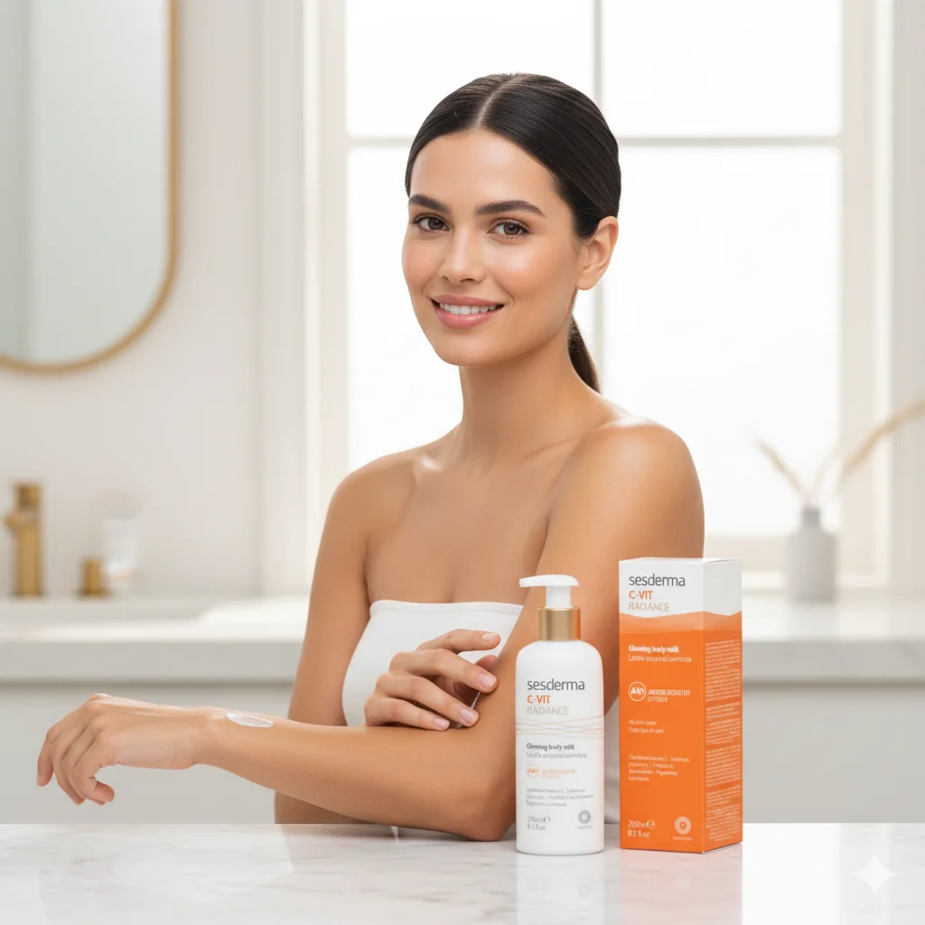 Sesderma C-VIT Radiance Glowing Body Milk is a body lotion specifically designed to enhance skin radiance and provide antioxidant benefits. The “C-VIT” in the name indicates that Vitamin C is a key ingredient, which is renowned for its brightening, evening skin tone, and antioxidant properties. The product is described as “Leche corporal luminosa” (luminous body milk) and contains a “ANTIOX BOOSTER SYSTEM,” suggesting a powerful blend of antioxidants. It is formulated with “Stabilized Vitamin C,” ensuring its efficacy, along with “Luminous pigments” (Pigmentos luminosos) to provide an immediate glow. The product is suitable for “All skin types” (“Todo tipo de piel”). It comes in a 250ml (8.5 fl. oz.) bottle with a pump dispenser, making it convenient for daily use. Sesderma is a dermocosmetic brand known for its advanced formulations and use of nanotechnology to deliver active ingredients effectively.