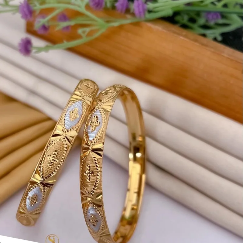 Each diamond-shaped center is intricately etched to catch the light, while the surrounding gold borders feature delicate machine-cut patterns that provide a multi-dimensional sparkle. Crafted from a high-quality, skin-friendly alloy, these bangles offer the opulent look of solid gold and silver without the heavy weight. Their timeless ethnic appeal makes them the ideal accessory for weddings, festive celebrations, or adding a touch of regal charm to your everyday traditional attire.
