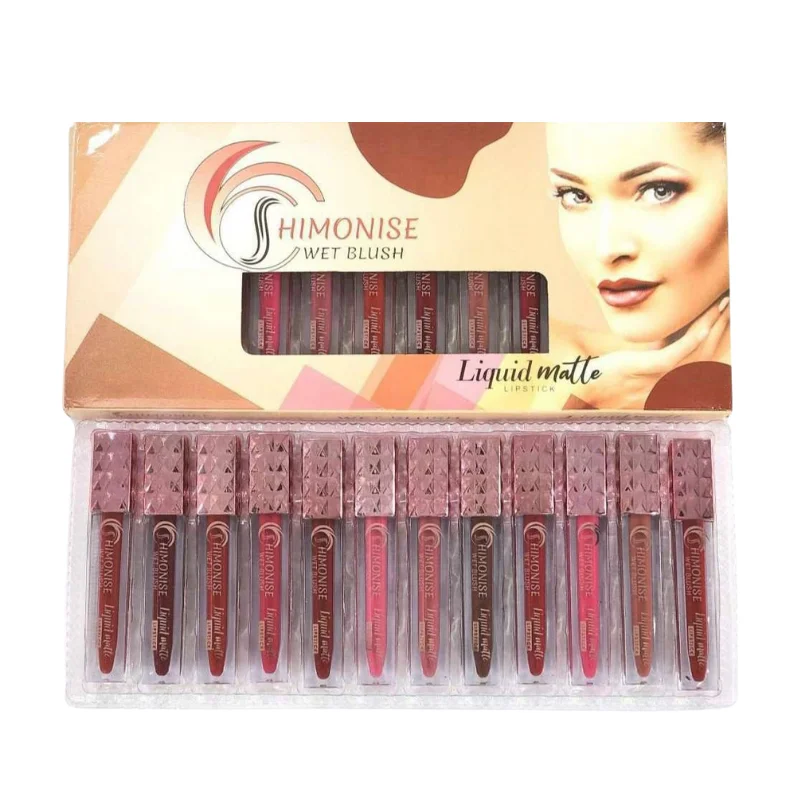 This is a comprehensive set of liquid matte lipsticks from the brand Shimonise, presented in an attractive retail box. The set features multiple shades, indicated by the variety of colors seen in the individual lipstick tubes. The packaging suggests a focus on “wet blush” for the liquid matte lipstick, which might imply a formula that provides a vibrant color application despite a matte finish. The overall presentation, with a model’s face on the box, aims to appeal to a demographic interested in beauty and makeup products. The lipsticks appear to be full-sized, suggesting a long-lasting supply of various shades for different looks and occasions.