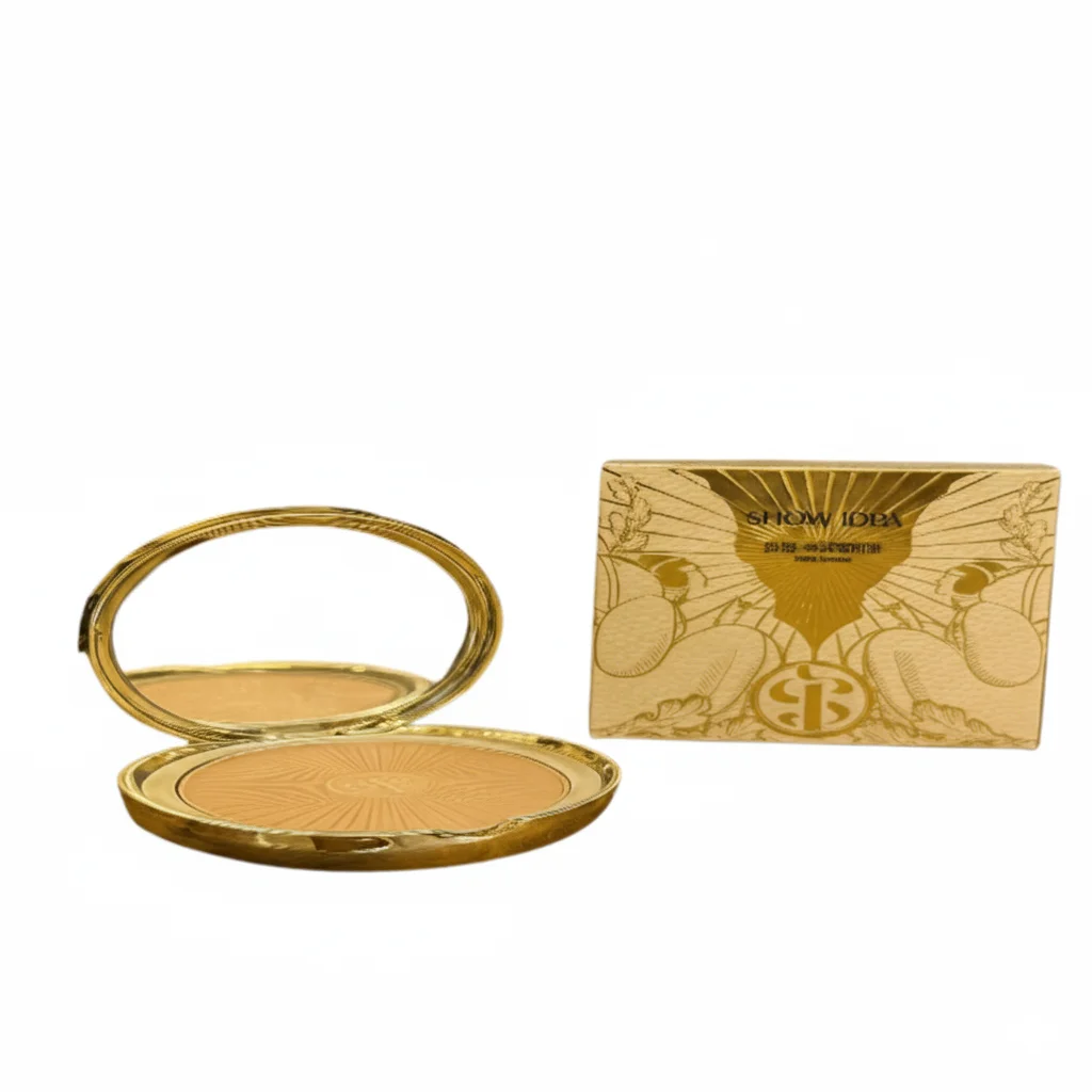 This cosmetic product is the Mayan Gilt Embossed Pressed Powder from the brand SHOW IDEA. The Chinese characters on the packaging,,” translate to “Mayan Gilt Embossed Powder Cake.” It is presented in an ornate, gold-toned, round compact that includes a mirror for on-the-go application. The powder itself features a detailed, sunburst-like embossed pattern. The accompanying box is decorated with an elegant, art-deco-style design in gold, reinforcing the luxurious and vintage aesthetic of the product. This pressed powder is likely intended to set makeup, control shine, and provide a smooth finish to the skin.