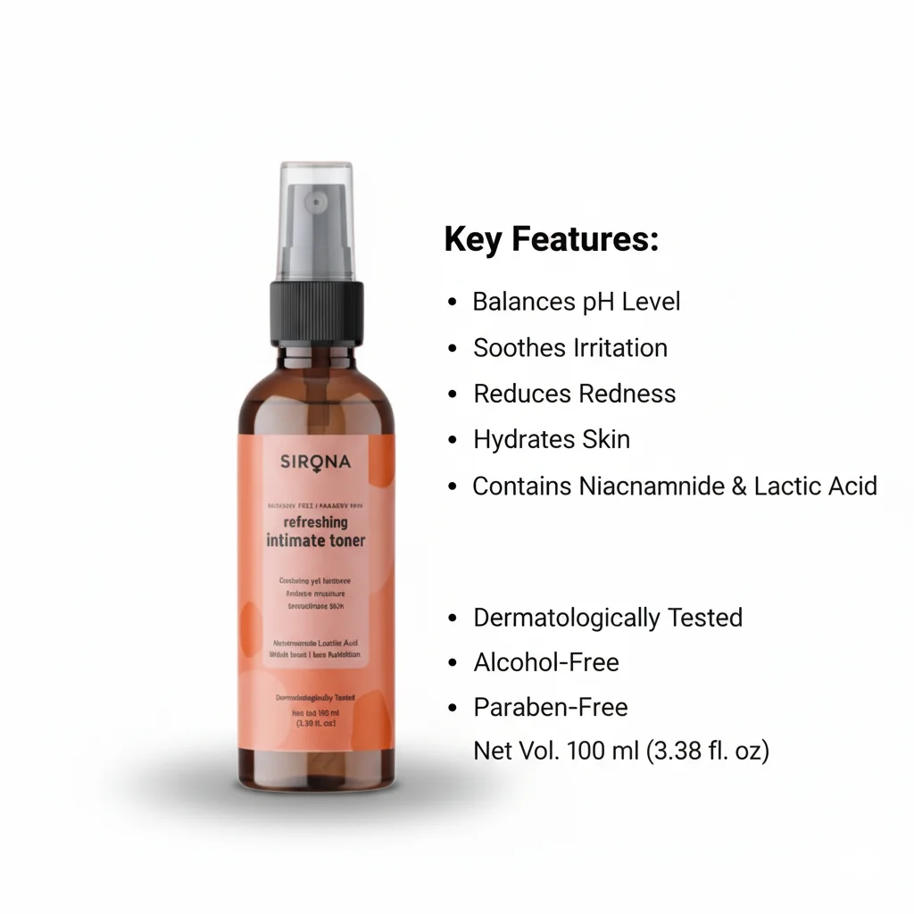 The SIRONA Refreshing Intimate Toner is formulated to help maintain intimate hygiene and freshness. It is described as being “PARABEN FREE” and “ALCOHOL FREE,” indicating a gentle formulation. The toner aims to restore pH balance, soothe the skin, and boost natural moisture. It also states “dermatologically tested,” suggesting it’s suitable for sensitive skin.