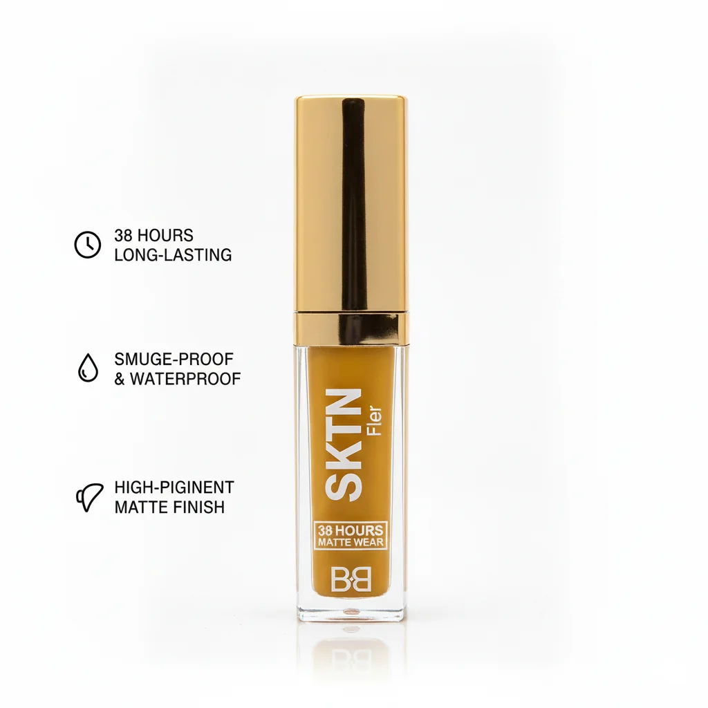 “Unleash bold and beautiful color with the SKTN Fler 38 Hours Matte Wear Liquid. This innovative product delivers intense pigmentation and a sophisticated matte finish designed to last. With an impressive wear time of 38 hours, you can trust your look to stay vibrant and fresh without fading, smudging, or transferring. The ‘Fler’ designation might suggest a ‘flair’ for color or a specific collection within the SKTN line. Its precise applicator ensures smooth, even coverage, allowing for effortless definition. Whether you’re looking for a striking lip statement or a long-wear eye accent, this formula provides comfortable wear without compromising on durability or color payoff. Encased in elegant clear packaging with a luxurious gold cap, SKTN Fler combines high performance with chic aesthetics.”