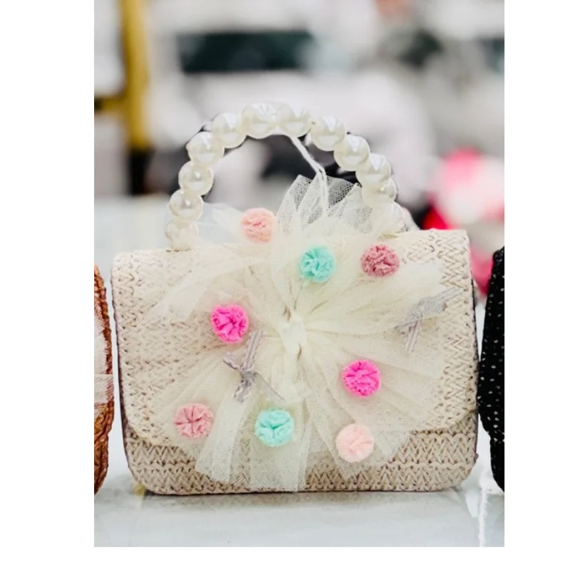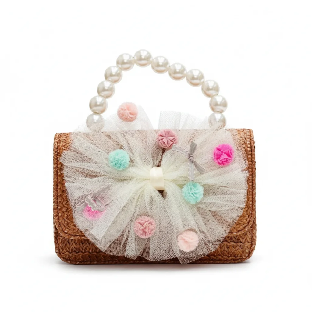 Sophisticated Woven Mini Handbag with Pearl Handle & Whimsical Tulle Bow