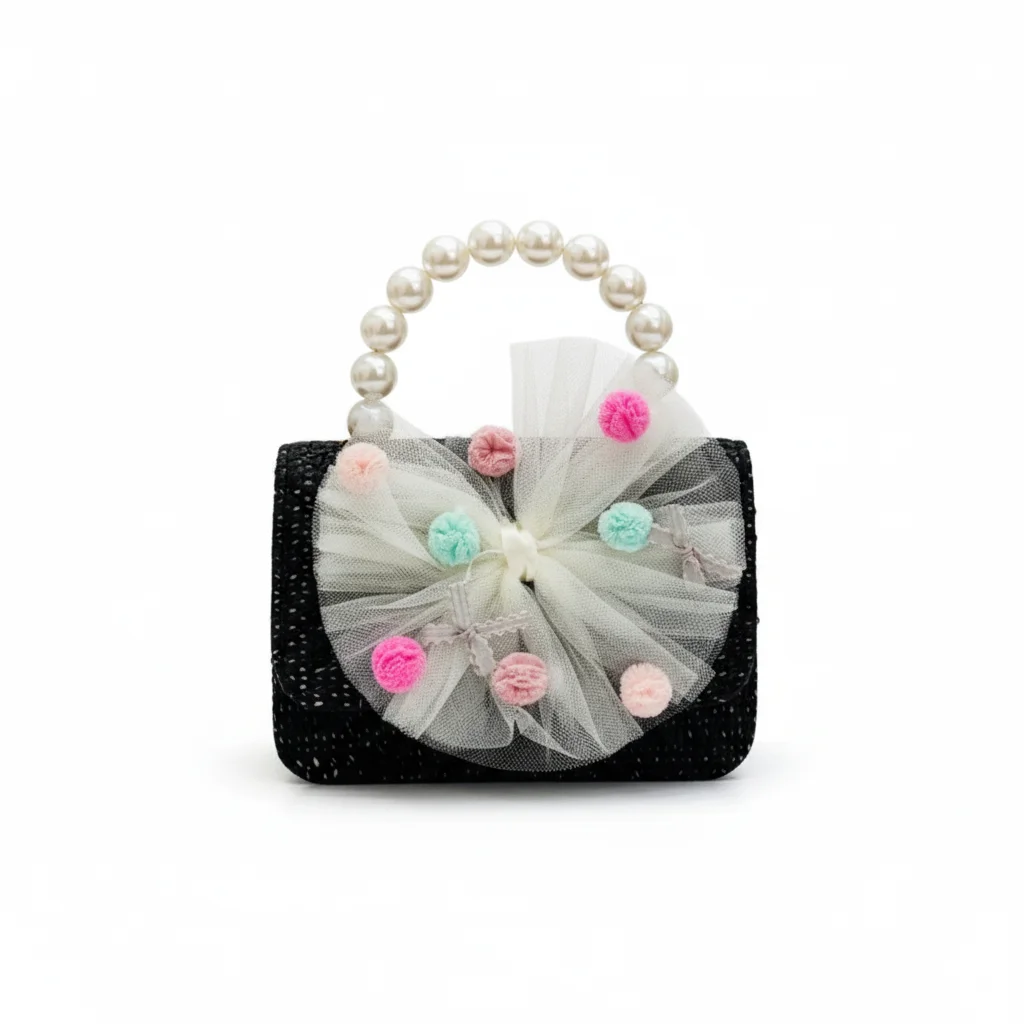 “Vintage Princess” Sequin & Lace Mini Handbag with Pearl Handle, Lavender Bow & Pom-Pom Accents