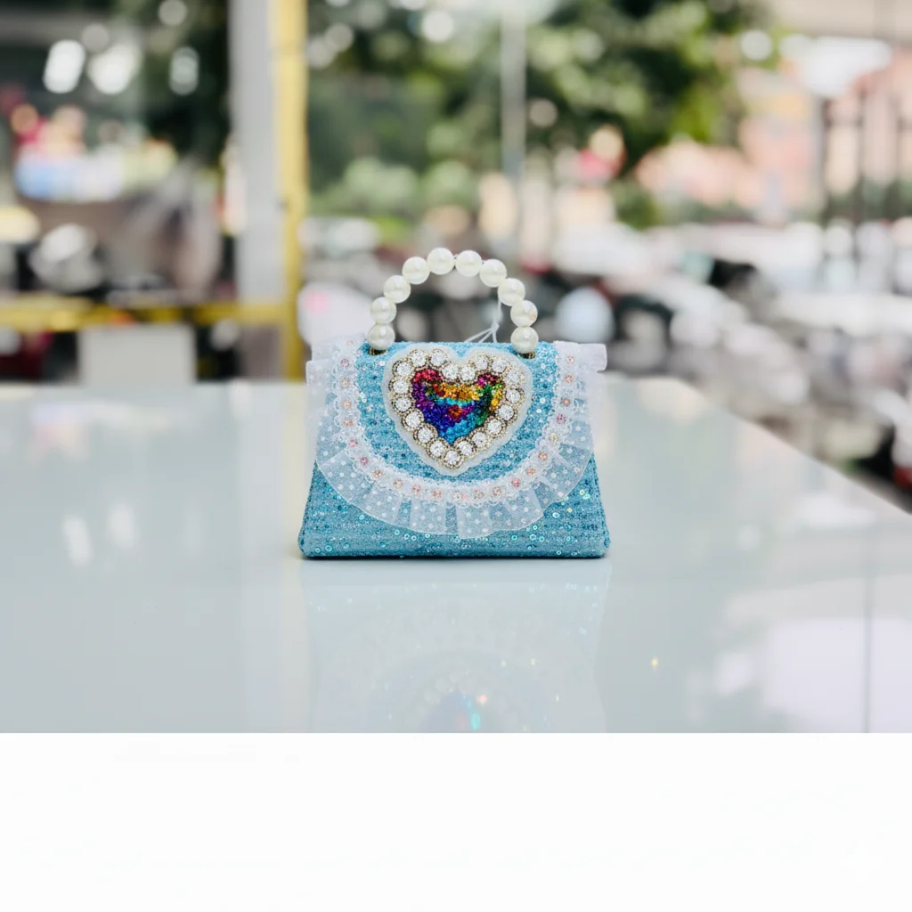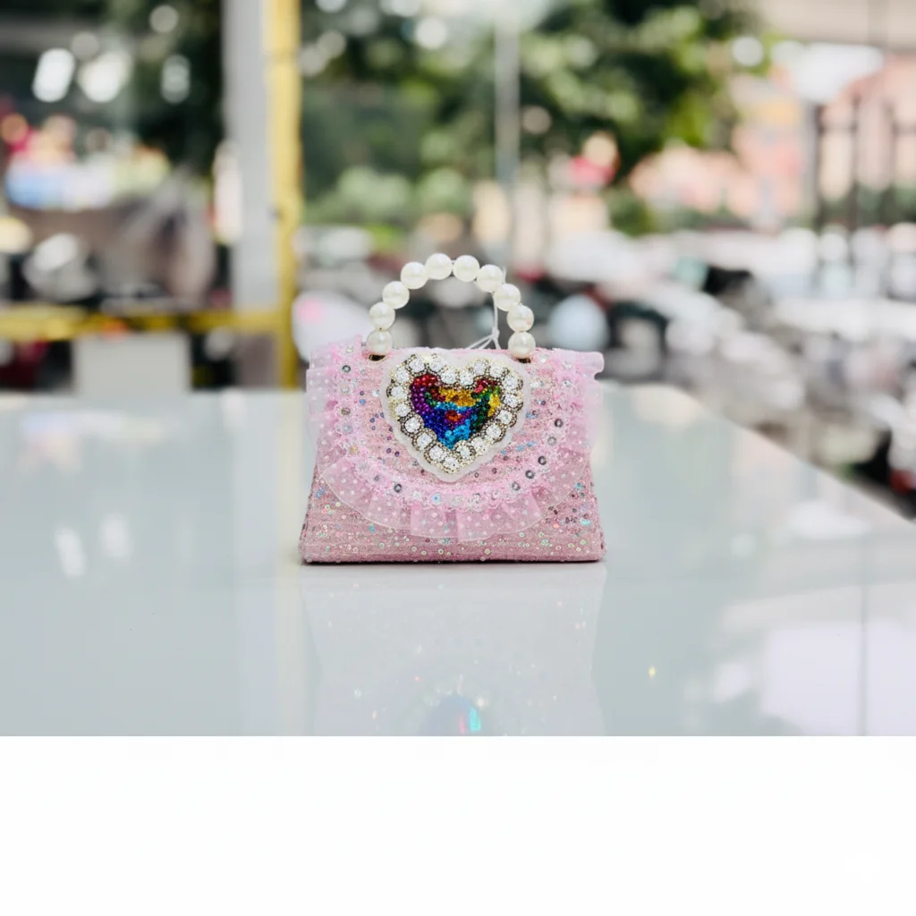 Sparkling “Princess Heart” Mini Handbag with Pearl Handle & Rainbow Sequin Detail