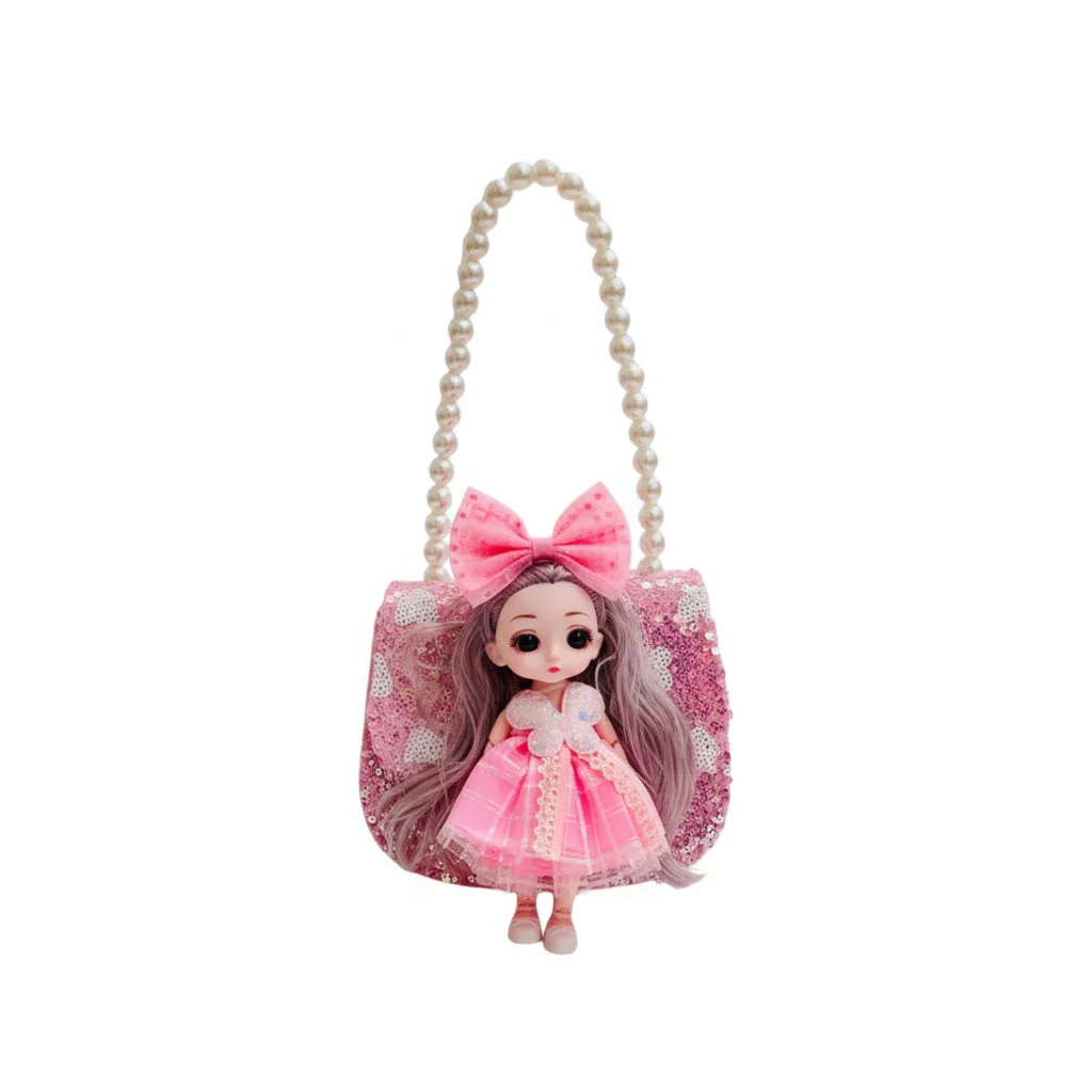 Sparkly Princess Doll Handbag for Little Girls – Cute Sequin Tote Purse with 3D Fashion Doll, Lace Dress, & Elegant Faux Pearl Handle