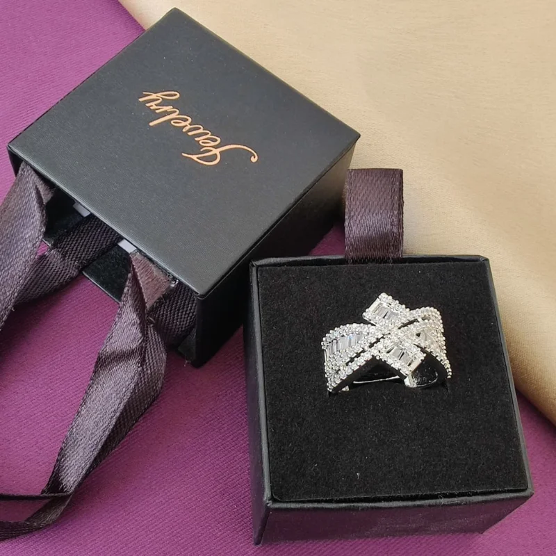 Expertly crafted in high-quality 925 sterling silver and finished with a polished rhodium plating, this ring offers the weight and luxurious look of fine white gold while remaining tarnish-resistant. Its architectural design makes it a perfect choice for a cocktail ring, a bold right-hand ring, or a fashion-forward wedding band alternative. The piece is elegantly presented in a premium black drawer-style gift box, accented with a gold “Jewelry” script and matching satin ribbon handles for a sophisticated touch.
