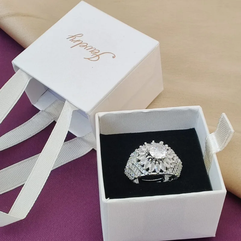 Supporting this grand centerpiece is a wide, tapered band meticulously encrusted with multiple rows of shimmering micro-pave stones, ensuring a continuous flow of brilliance around the finger. Crafted in premium 925 sterling silver and finished with a high-luster rhodium plating, this ring offers a durable, tarnish-resistant finish and a sophisticated white-gold appearance. Presented in a clean, minimalist white drawer-style gift box with a gold “Jewelry” script and elegant satin ribbon handles, it is a spectacular choice for a cocktail ring, anniversary gift, or a unique alternative to a traditional engagement ring.