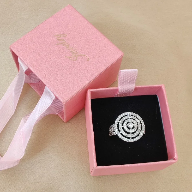 The ring’s sophisticated focal point is balanced by a wide, multi-row shank, also adorned with pave stones, providing both a comfortable fit and a substantial, luxurious presence on the finger. Crafted in premium 925 sterling silver and finished with a high-luster rhodium plating, this piece offers a tarnish-resistant, white-gold appearance. It is a stunning choice for a cocktail ring or a unique modern alternative to traditional bridal jewelry. The ring arrives beautifully presented in a signature pink drawer-style gift box featuring a gold “Jewelry” script and elegant satin ribbon handles.