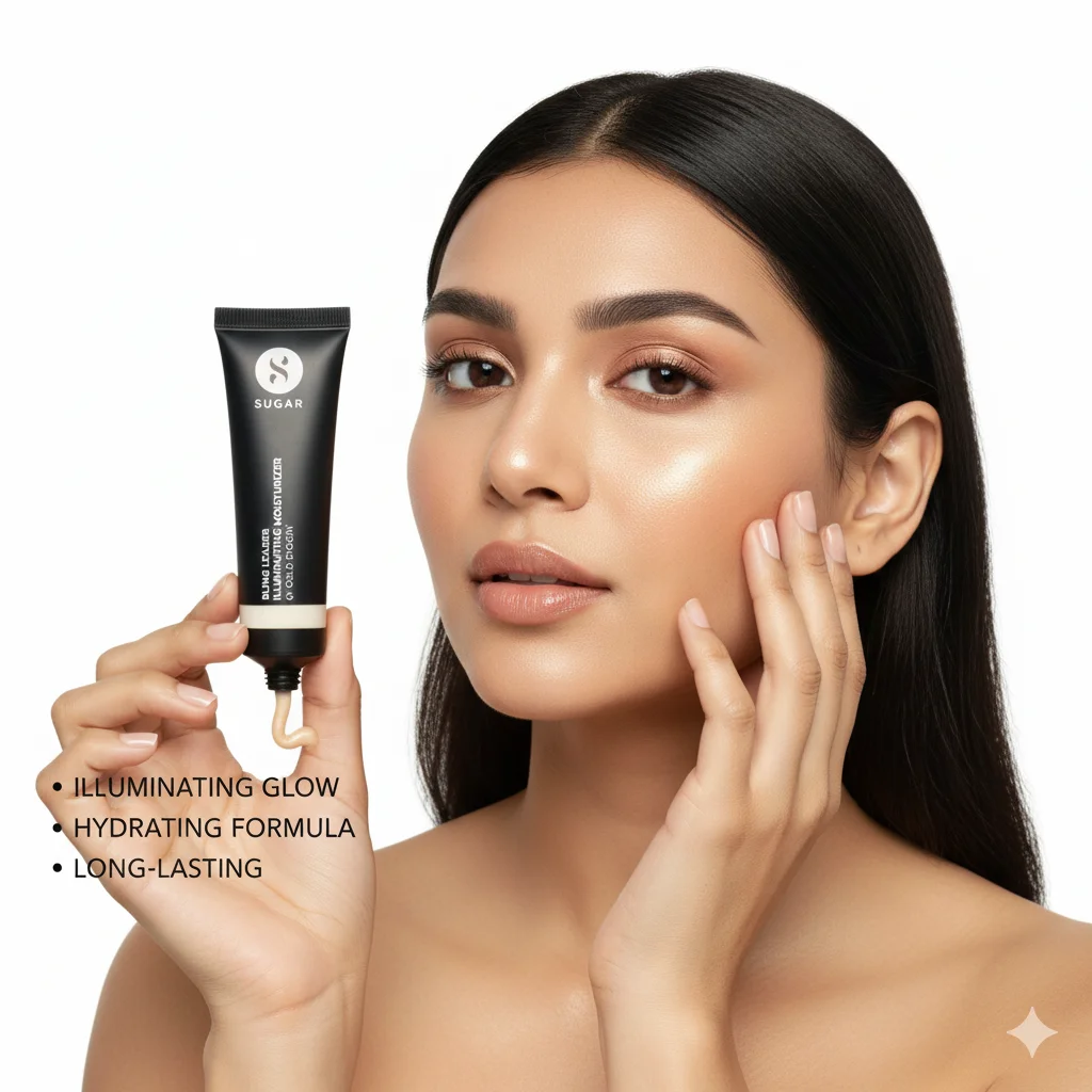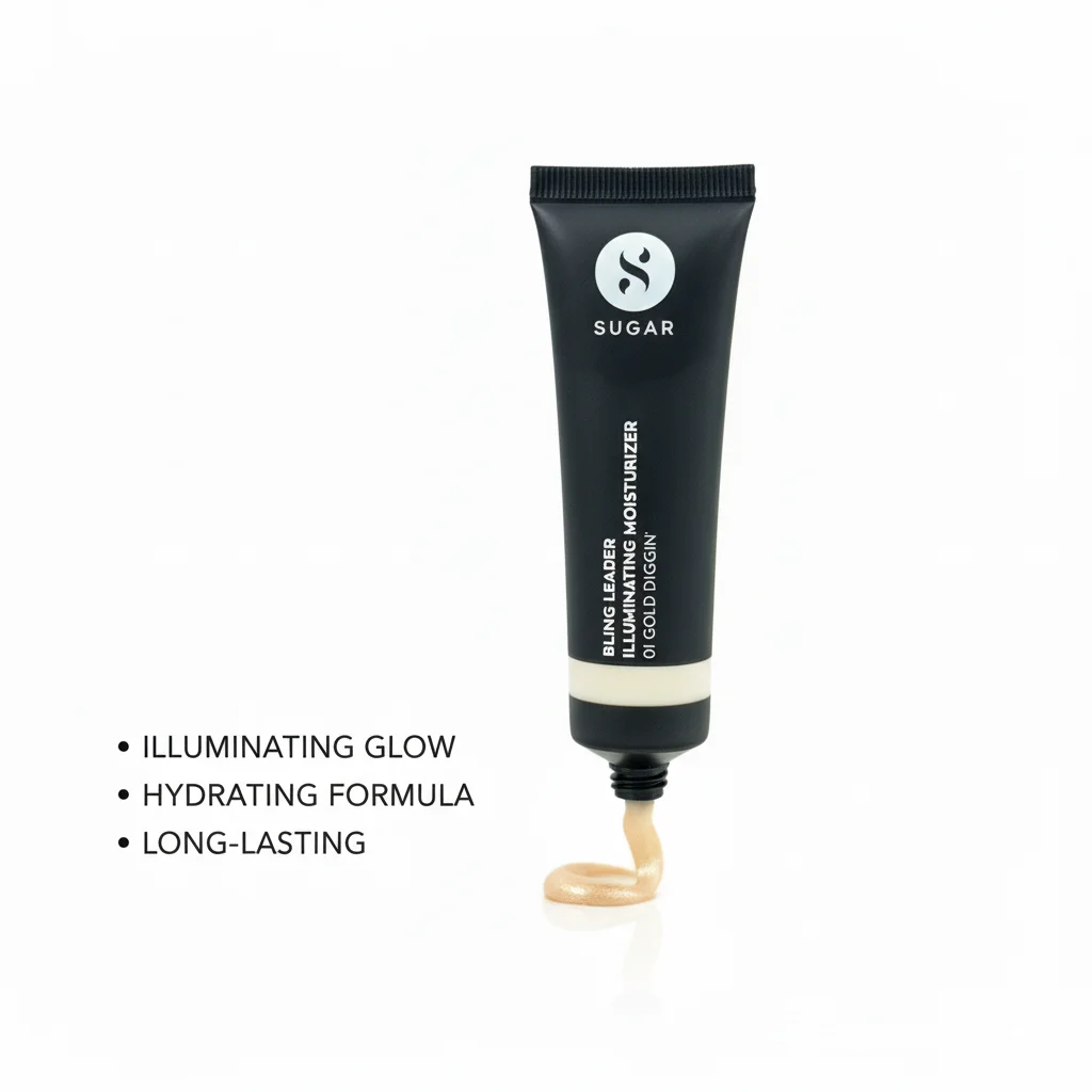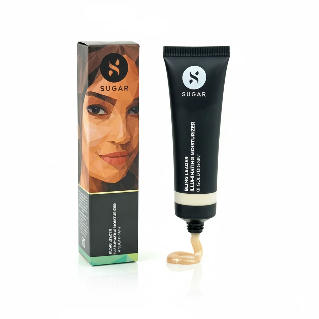 The SUGAR Bling Leader Illuminating Moisturizer is designed to give your skin a radiant and glowing finish. This particular shade, “01 Gold Diggin’,” suggests a warm, golden shimmer. It comes in a sleek black tube with the SUGAR logo, indicating a modern and chic aesthetic. The packaging also features a stylized illustration of a woman’s face, likely to represent the target demographic and the illuminating effect of the product. The product description on the box and tube clearly states its name and shade.