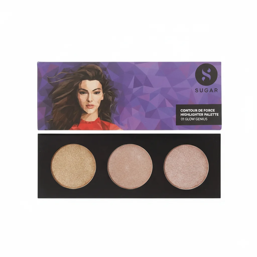 The SUGAR Contour De Force Highlighter Palette in the shade “01 Glow Genius” is a makeup palette designed to illuminate and highlight the face. The product comes in a rectangular cardboard packaging. The top part of the packaging features a stylized geometric illustration of a woman’s face on a purple background, along with the “SUGAR” brand logo. Below this, the palette itself is a sleek, black rectangular case containing three circular pans of highlighter. These highlighters appear to be in varying shades, ranging from a golden champagne to a rosy champagne and a slightly deeper peach-toned champagne, all with a metallic, shimmery finish. This palette is intended to provide a versatile range of highlighting options for different skin tones or desired effects.