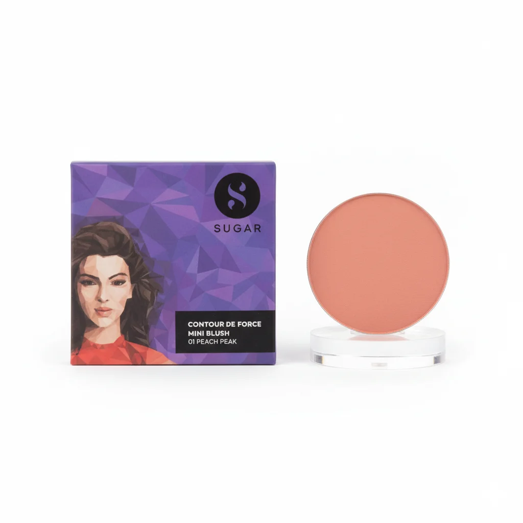 The SUGAR Contour De Force Mini Blush in “01 Peach Peak” is a compact, single-pan blush designed to add a natural flush of color to the cheeks. This specific shade, “Peach Peak,” suggests a warm, peachy hue, ideal for imparting a fresh and healthy glow. The blush comes in a circular pan, positioned next to its small, square-shaped outer packaging. The packaging features a consistent design with other “Contour De Force” products, displaying a stylized, low-poly art illustration of a woman on a vibrant purple background. This mini blush is perfect for on-the-go touch-ups or for those who prefer individual blush shades rather than palettes.