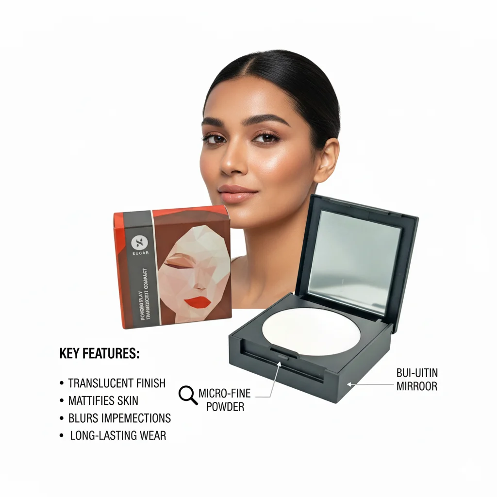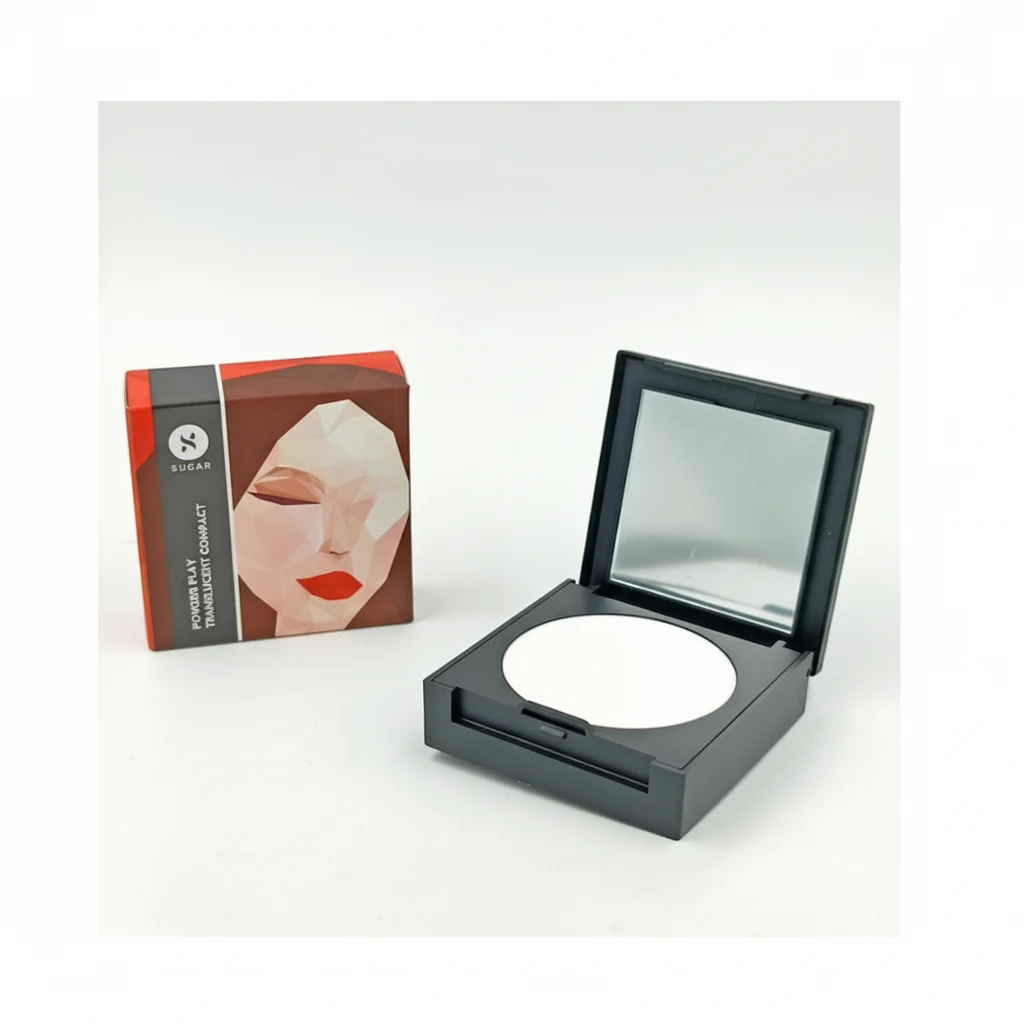 The SUGAR Power Play Translucent Compact is a meticulously crafted pressed powder designed to provide a flawless finish to your makeup. The product comes in a sleek, black compact case with a built-in mirror, making it convenient for on-the-go touch-ups. Inside, the translucent powder is finely milled to ensure a smooth application that blends seamlessly with various skin tones without leaving a white cast. The packaging features a distinctive red and brown color scheme with an abstract, geometric illustration of a face, reflecting a modern and artistic aesthetic. This compact is ideal for setting makeup, controlling shine, and blurring imperfections, giving the skin a refined and natural look. The outer carton reiterates the brand and product name, emphasizing its “Power Play” and “Translucent Compact” attributes.
