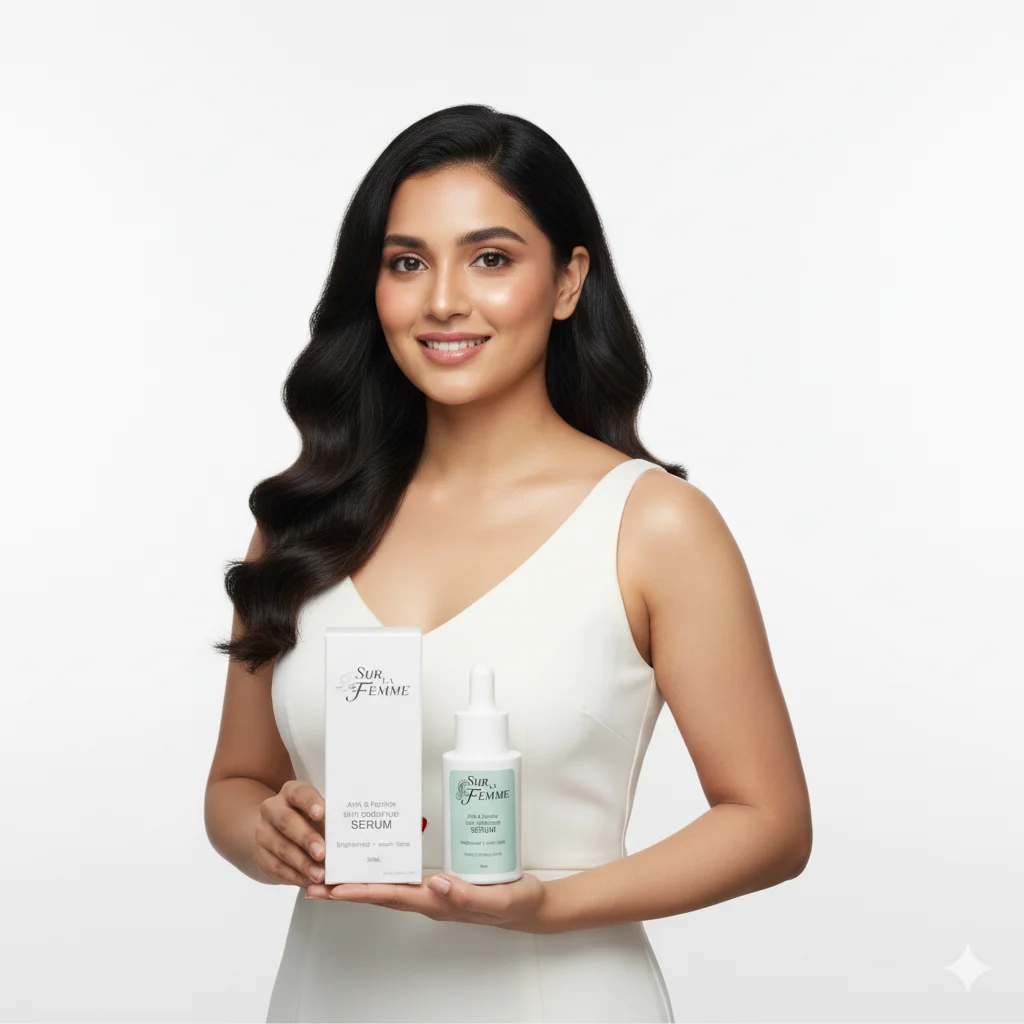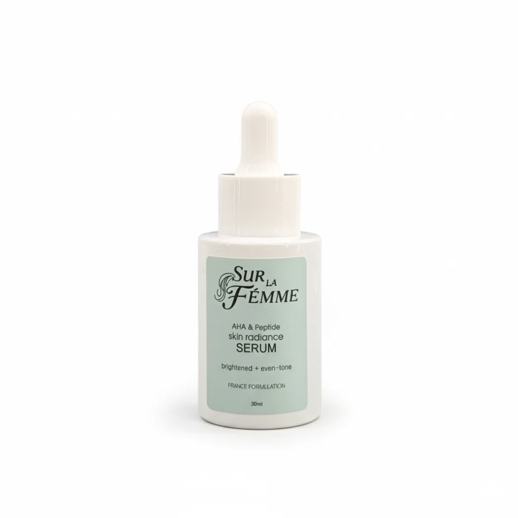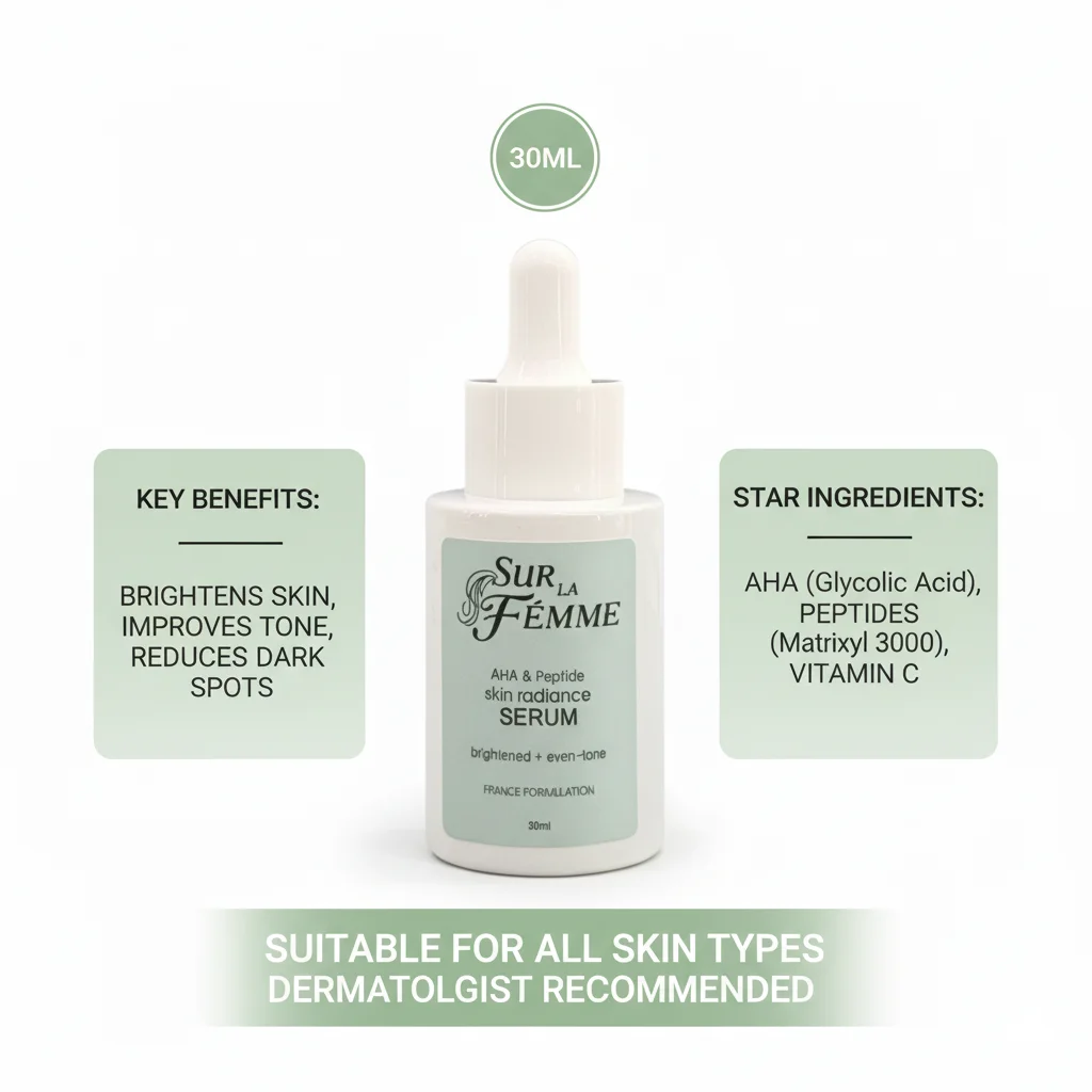 The SUR LA FEMME Anti-Aging & Peptide Brightening Serum is a skincare product designed to address signs of aging and promote a brighter, more even skin tone. It comes in a 30ml dropper bottle, indicating a concentrated formula. The packaging suggests a focus on elegance and effectiveness, with a clean white design and a hint of light green, possibly representing natural or refreshing ingredients. The serum aims to provide a targeted solution for those looking to improve skin radiance and reduce the appearance of fine lines and wrinkles.