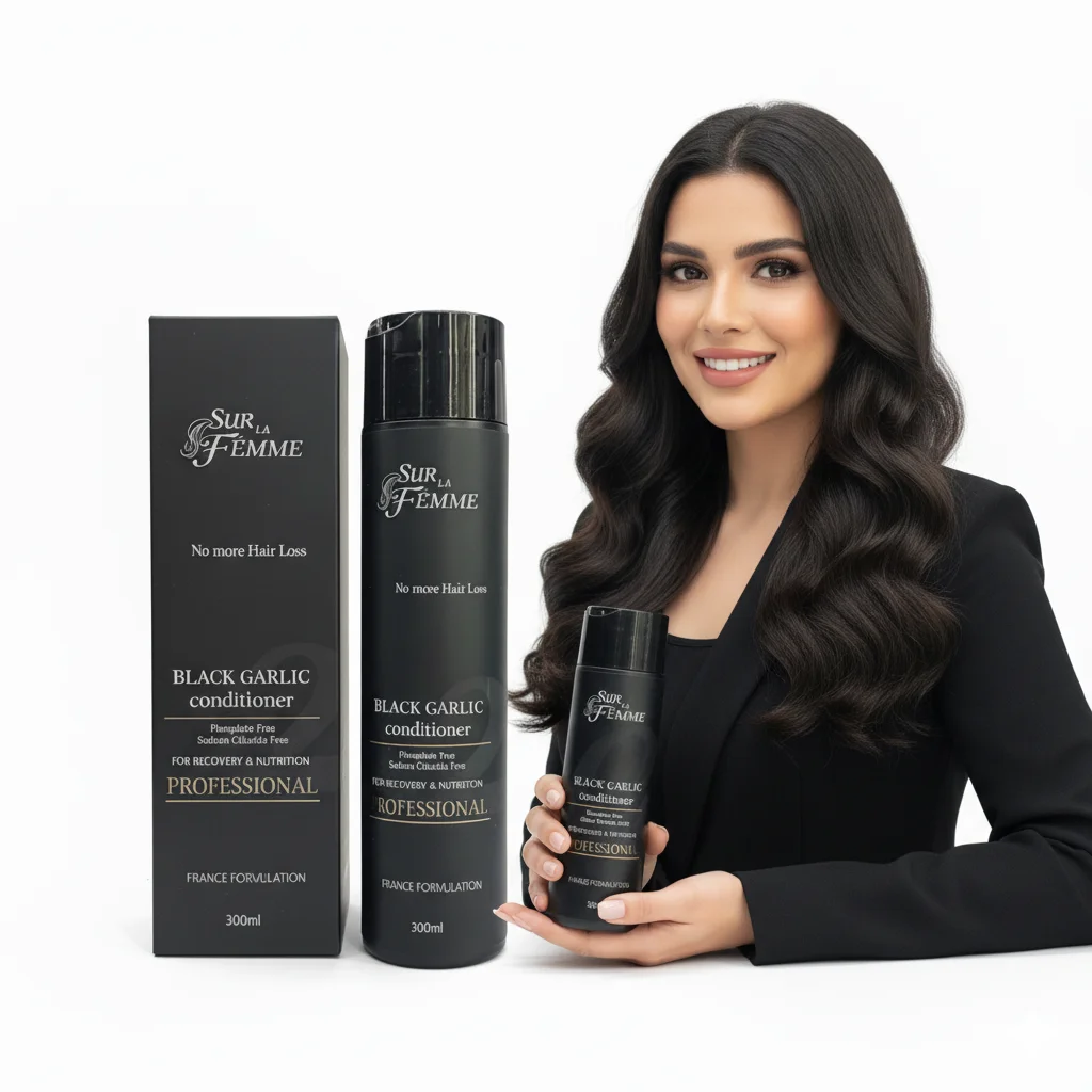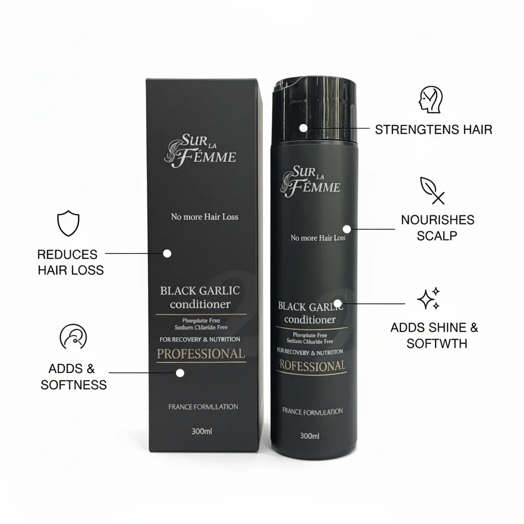 The SUR LA FEMME PROFESSIONAL Black Garlic Conditioner is a high-performance hair care product designed to complement the Black Garlic Shampoo, specifically targeting hair loss and providing intensive recovery and nutrition. It is housed in a sleek 300ml black bottle, presented in a matching sophisticated black box, emphasizing its “PROFESSIONAL” quality and “FRANCE FORMULATION.” Like its shampoo counterpart, it proudly states “No More Hair Loss” as its core benefit. The conditioner is “Phenphlate Free” (likely a typo and intended to be “Phthalate Free”) and “Sodium Chloride Free,” making it a gentle yet effective option for maintaining hair health without harsh chemicals. The “Black Garlic” ingredient suggests a focus on natural, fortifying components that nourish the scalp and hair, promoting strength, softness, and manageability while addressing hair thinning.