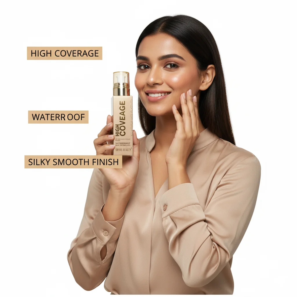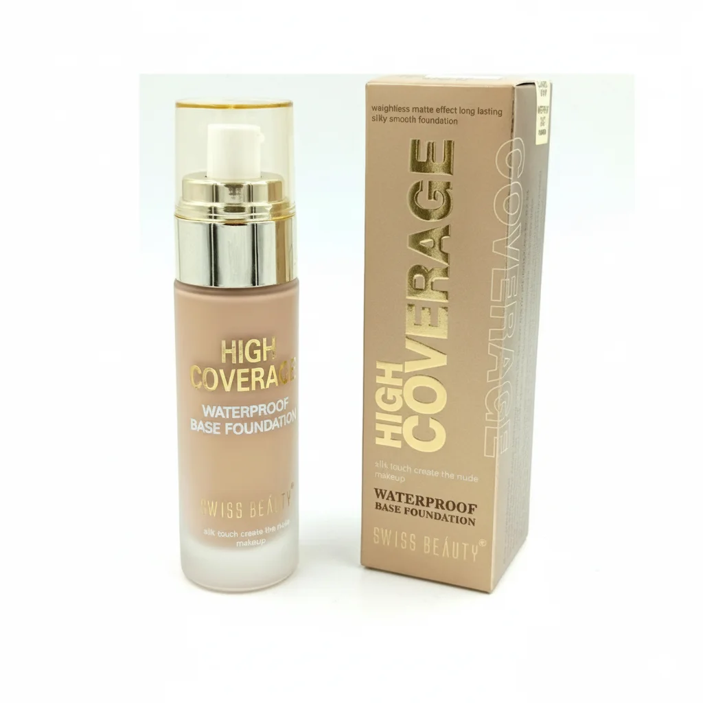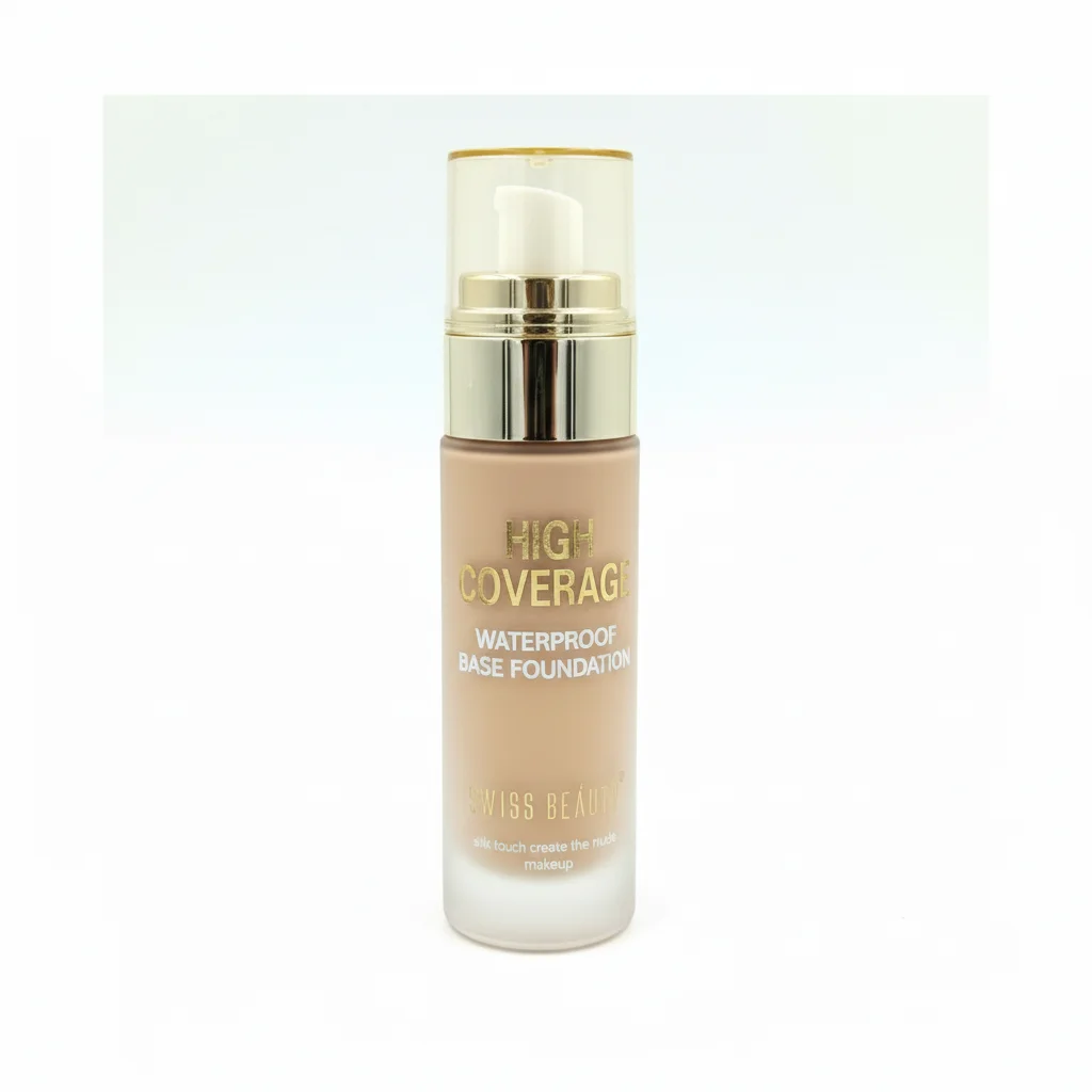 The Swiss Beauty High Coverage Waterproof Base Foundation is a liquid foundation presented in an elegant glass bottle with a pump dispenser and a gold-toned cap, emphasizing a premium feel. It is formulated to provide “high coverage” and is specifically marketed as “waterproof,” suggesting durability and resistance to moisture. The product aims to deliver a “weightless matte effect” that is long-lasting, providing a “silky smooth foundation” finish. The packaging also mentions “silk touch create the nude makeup,” implying a natural-looking yet perfected finish that feels soft on the skin. This foundation is designed for users seeking extensive coverage that can withstand various conditions while maintaining a smooth, non-shiny appearance. The shade in the image appears to be a light-to-medium neutral beige.