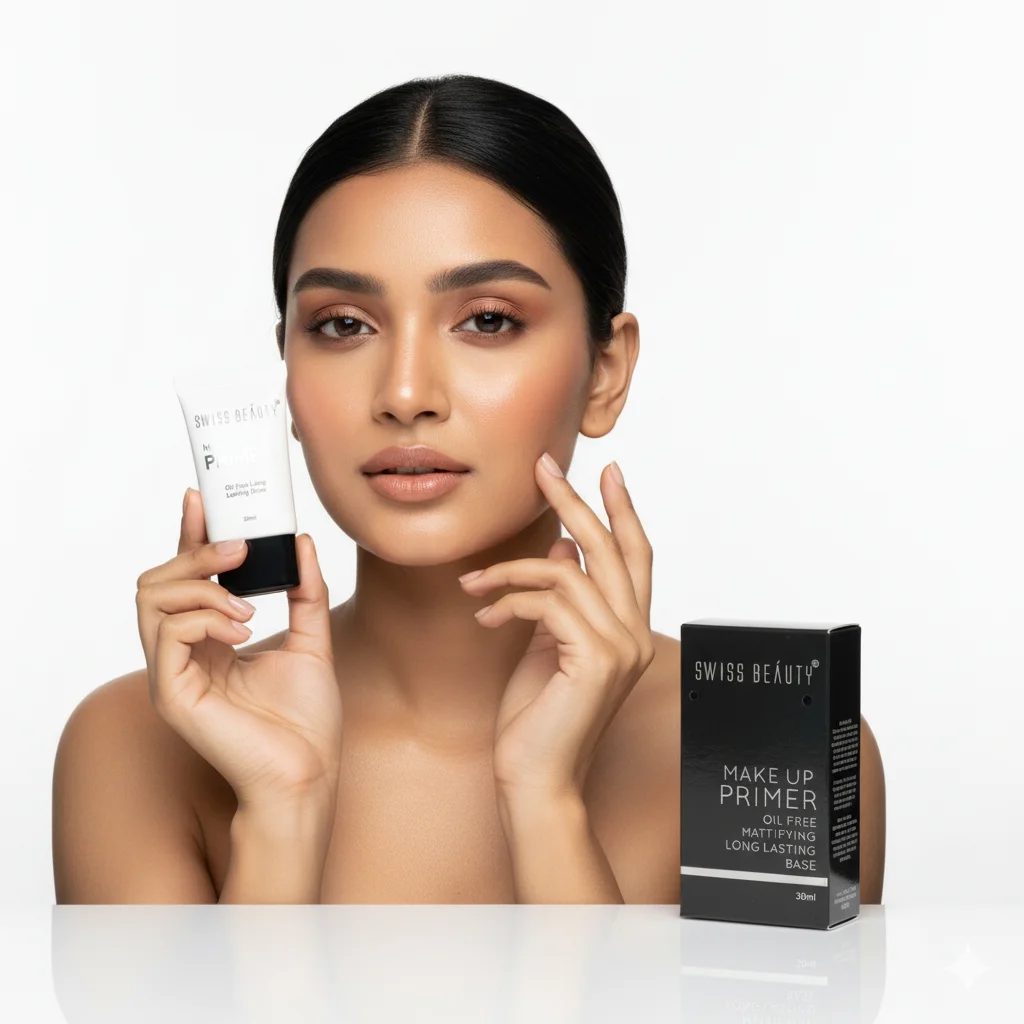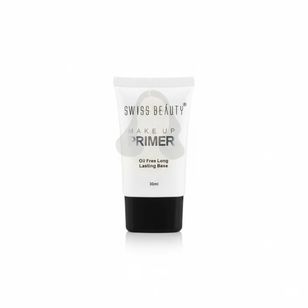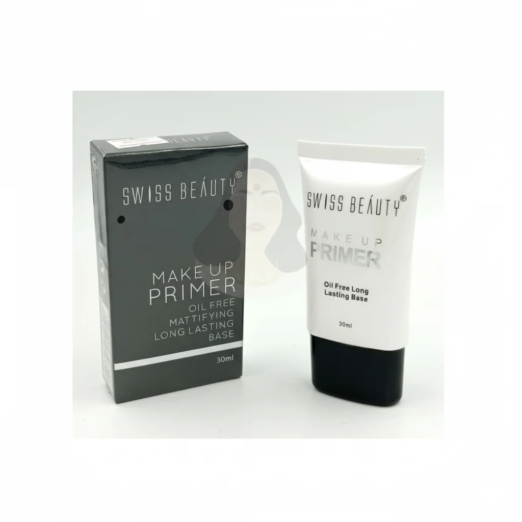 This product is a “Make Up Primer” from the brand “Swiss Beauty.” It comes in a black rectangular box with white text and a white squeeze tube with black text and cap. The primer is specifically formulated to be “Oil Free,” providing a “Mattifying” finish, and acting as a “Long Lasting Base” for makeup. Both the box and the tube indicate a volume of “30ml.” This primer is designed to prepare the skin for makeup application, helping to control shine and extend the wear of foundation and other cosmetics.