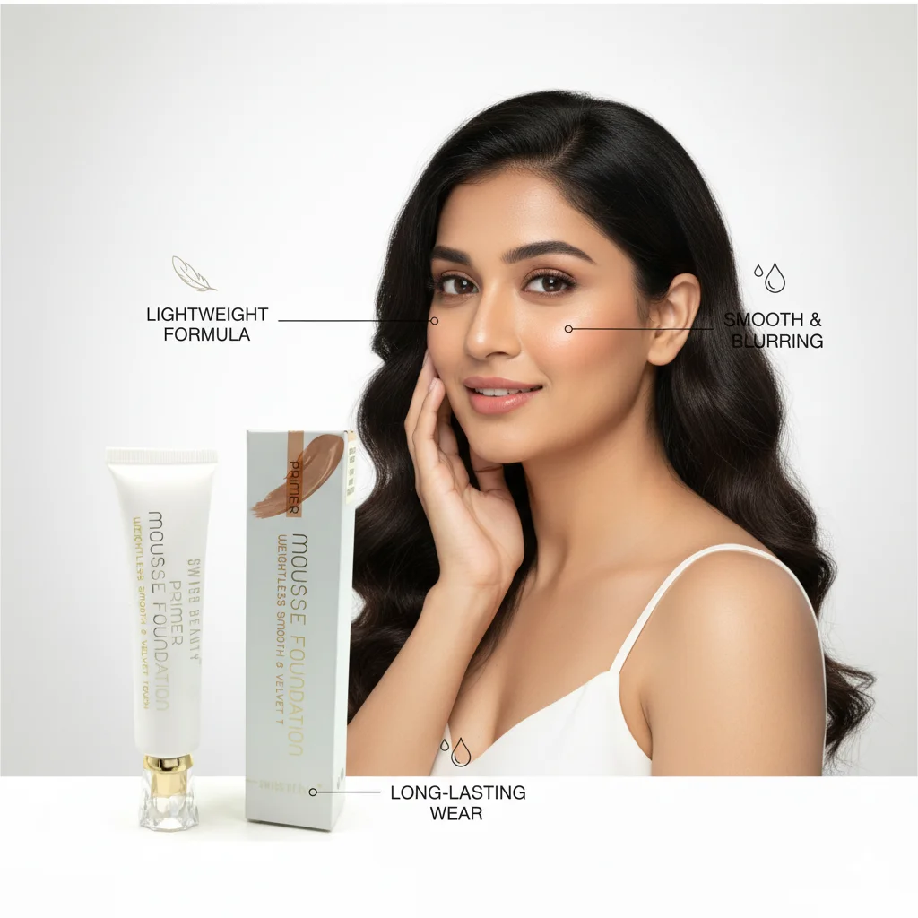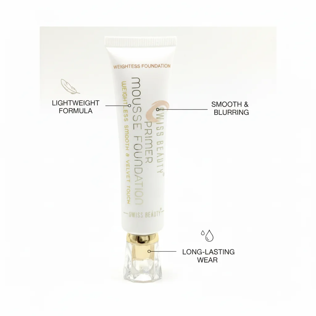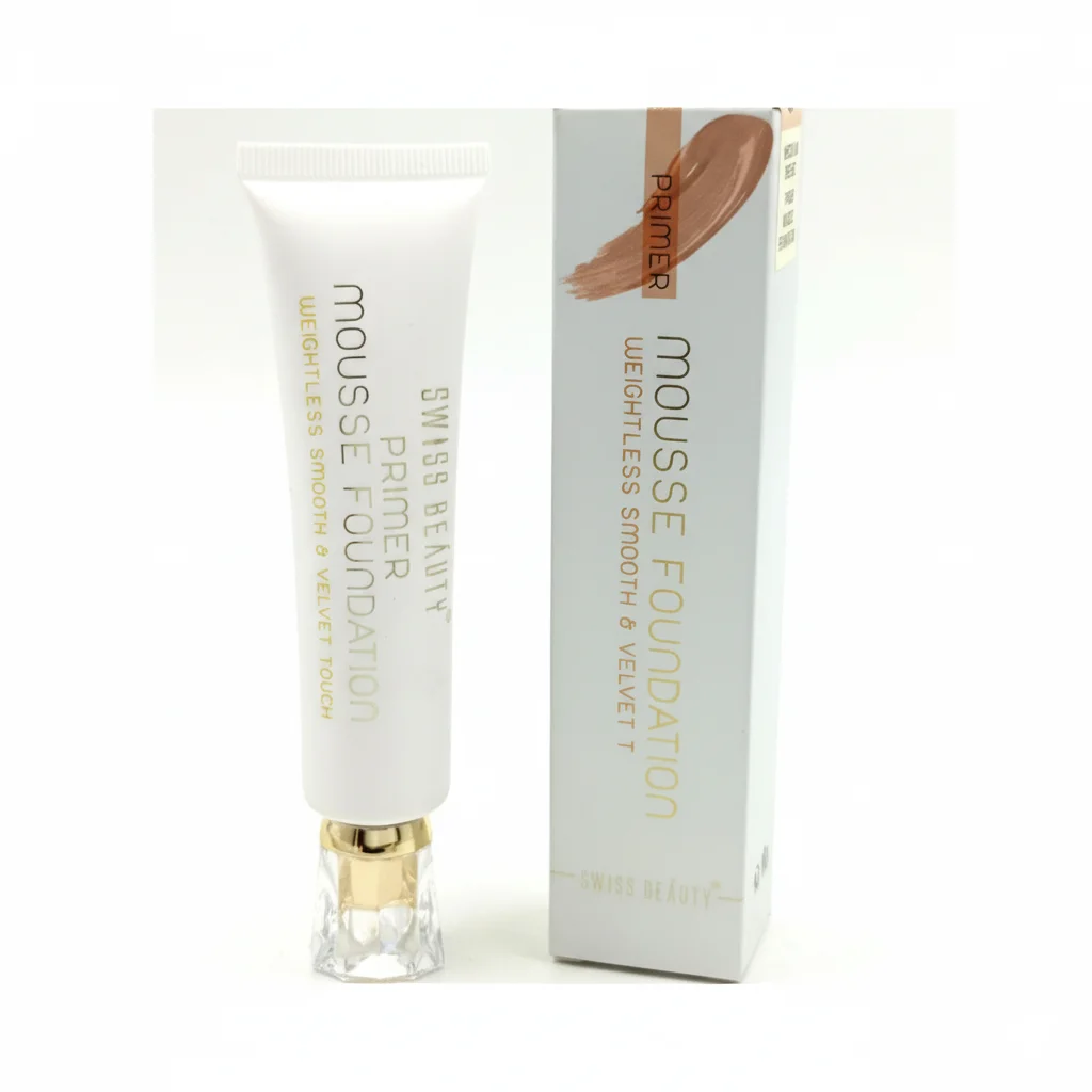 The Swiss Beauty Mousse Foundation Primer is a multi-functional product designed to act as both a primer and a foundation, aiming for a “weightless smooth & velvet touch” finish. It comes in a soft white squeeze tube with elegant gold and clear accents on the cap, giving it a premium feel. The packaging suggests a mousse-like texture, which typically provides a lightweight, airy feel on the skin. This product is formulated to create a smooth base for makeup, helping to minimize the appearance of pores and fine lines, while also providing some coverage as a foundation. The accompanying cardboard box features a swatch illustration in a medium skin tone, indicating its dual purpose and the kind of finish it offers. It’s intended to help makeup last longer and apply more evenly.