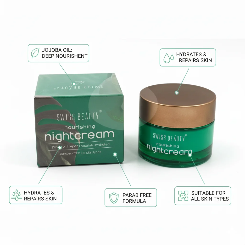 The Swiss Beauty Nourishing Nightcream is an overnight treatment designed to repair, nourish, and hydrate the skin while you sleep. It is enriched with Jojoba Oil, an ingredient known for its moisturizing and balancing properties. This night cream aims to restore the skin’s moisture barrier, reduce dryness, and leave your skin feeling soft and replenished by morning. It is also paraben-free and suitable for all skin types.