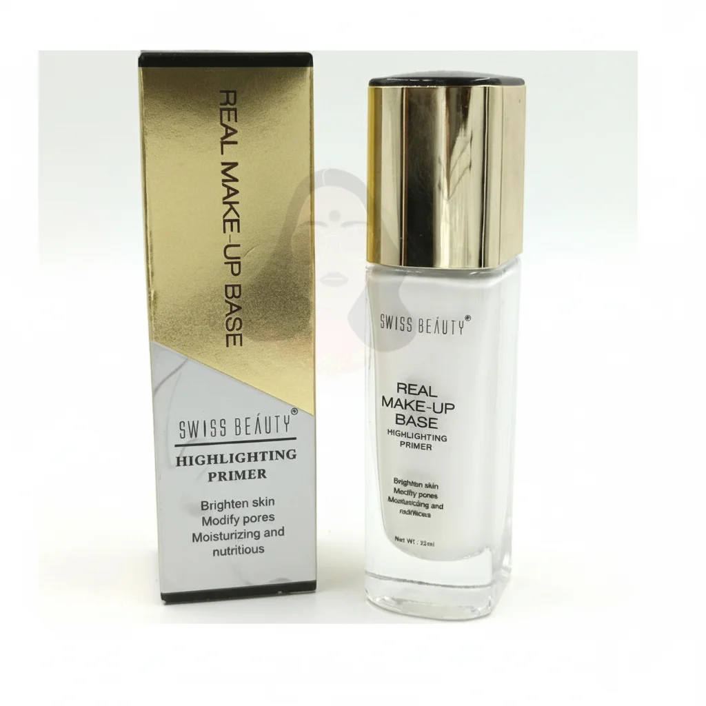 The Swiss Beauty Real Make-Up Base Highlighting Primer is a cosmetic product designed to prepare the skin for makeup application while adding a luminous glow. It comes in a sleek, white bottle with a golden cap, suggesting a premium feel. The primer itself appears to be a white liquid, consistent with highlighting primers that often contain light-reflecting particles. The packaging clearly states its primary functions: “REAL MAKE-UP BASE” and “HIGHLIGHTING PRIMER.” It’s formulated to brighten the skin, minimize the appearance of pores, and provide moisturization and nourishment, creating a smooth and radiant canvas for foundation and other makeup. The net weight is specified as 32ml.