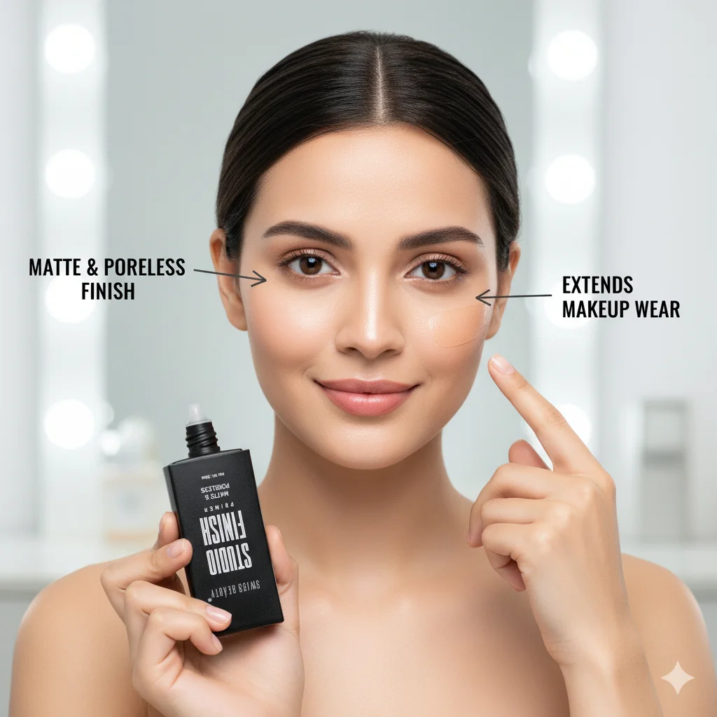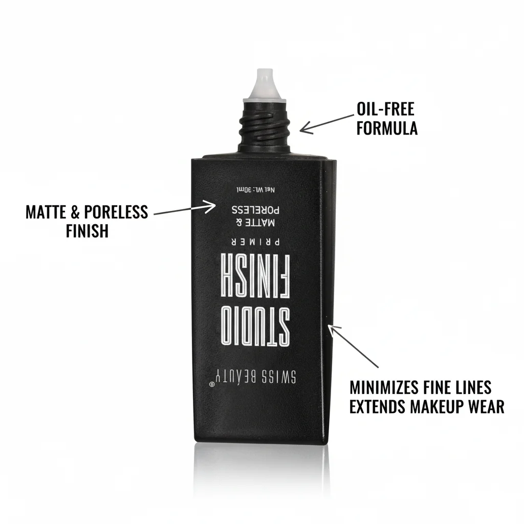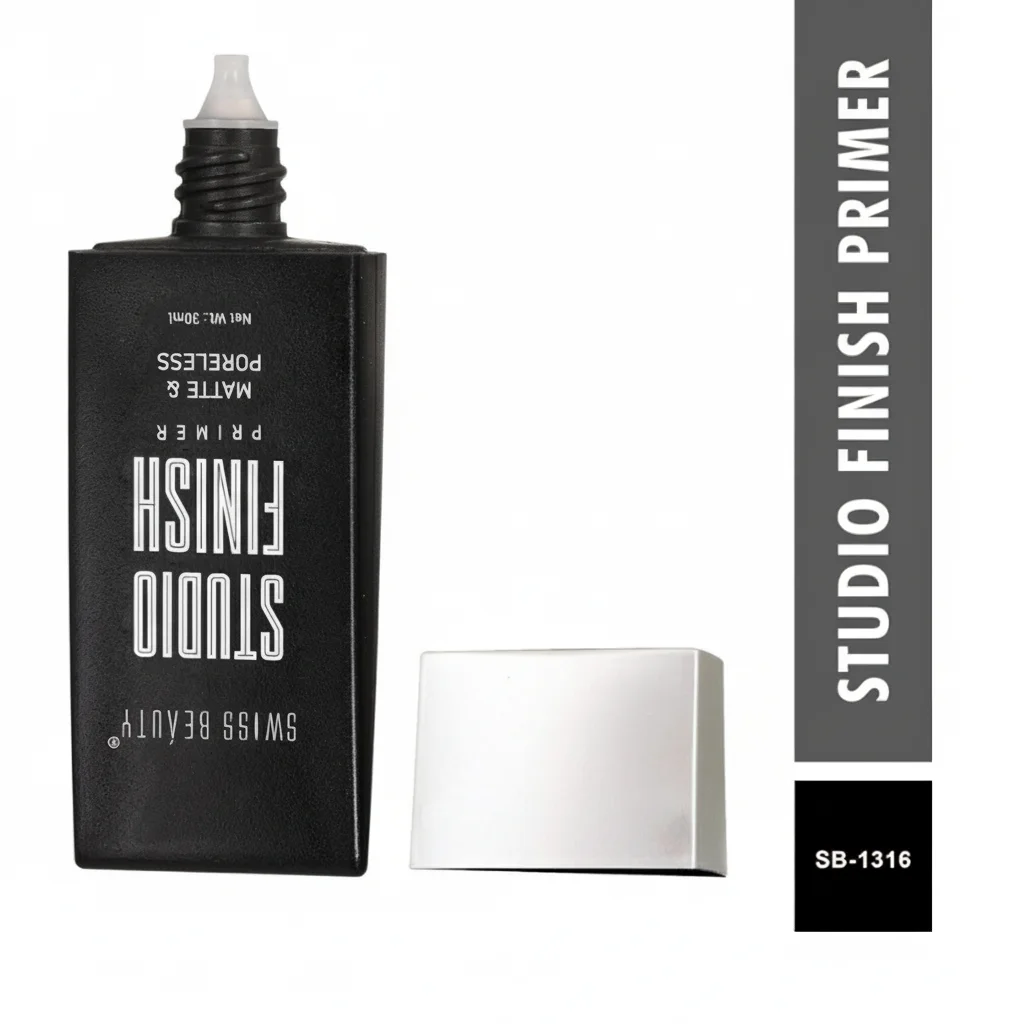 The Swiss Beauty Studio Finish Matte & Poreless Primer is a makeup primer designed to prepare the skin for makeup application by creating a smooth, matte, and poreless base. It comes in a sleek, rectangular black bottle with a black screw-on top that houses a precision dropper/dispenser for controlled application. The bottle clearly states the brand “SWISS BEAUTY” and the product name “STUDIO FINISH” with the attributes “MATTE & PORELESS PRIMER.” The net weight is indicated as 30ml. The product is also identified by the code SB-1316. The separate silver cap suggests a two-part dispensing system or a protective cap for the nozzle.